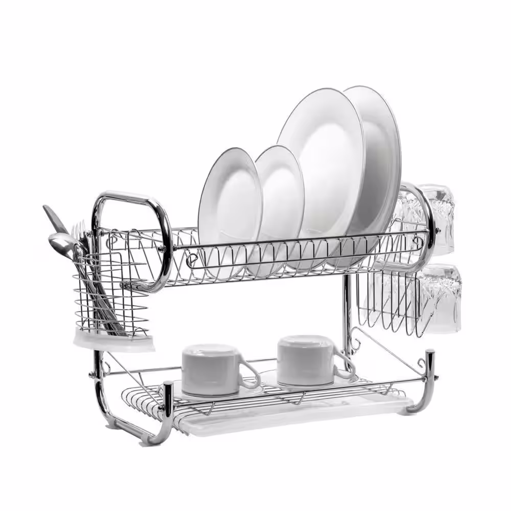 J&V TEXTILES 18 in. Chrome Stainless Steel 2-Tier Dish Rack with Utensil and Cutting Board Holder for Kitchen Counter