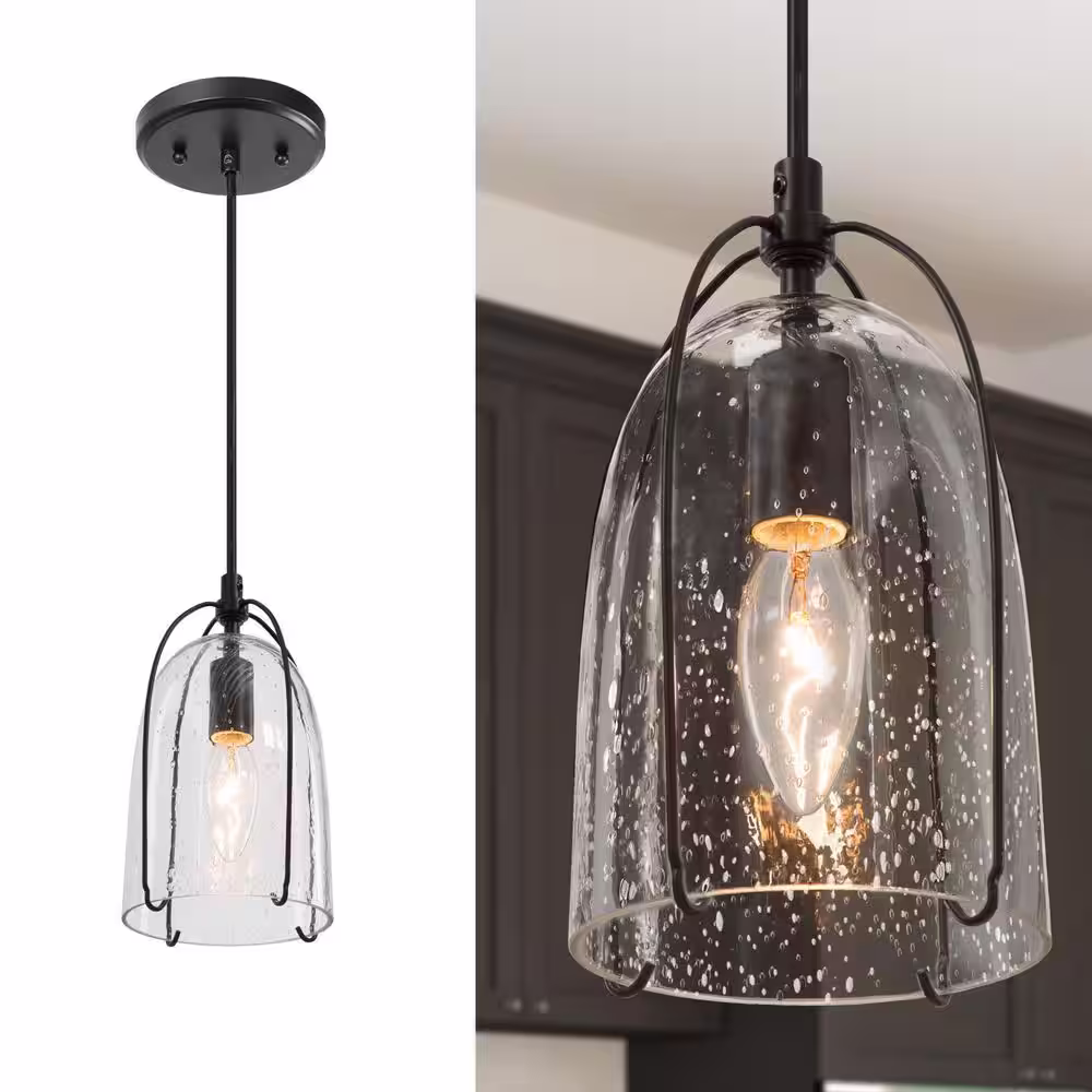 Hampton Bay Kendall Manor 1-Light Matte Black Mini Pendant Hanging Light, Kitchen Pendant Lighting with Clear Glass Shade