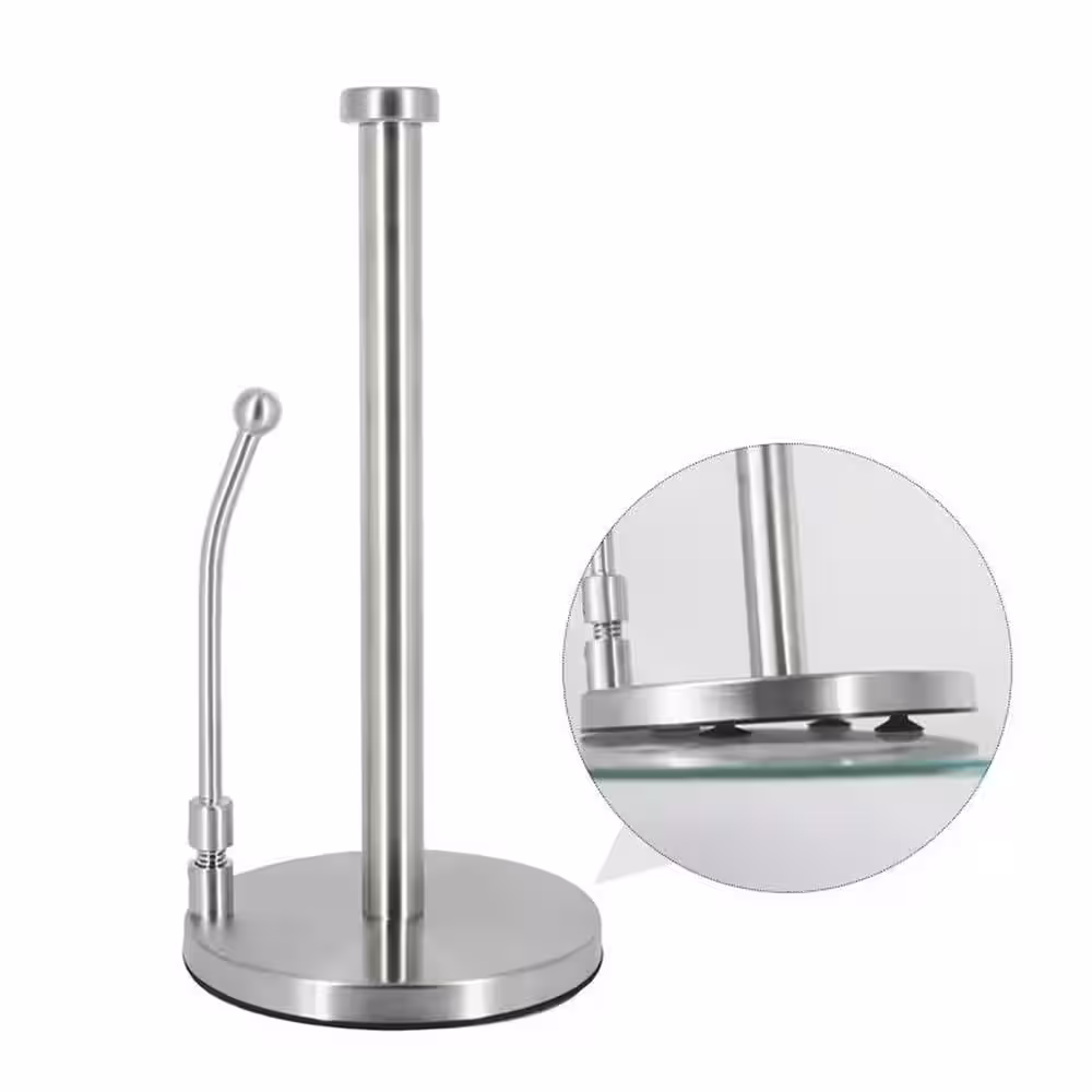 BWE Paper Towel Holder Dispenser Standing with Weighted Base Spring Arm for Kitchen, Bathroom, Bedroom In Stainless Steel