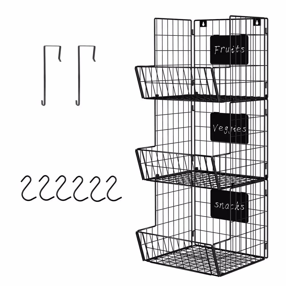dubbin 3-Tier Fruit Vegetable Storage Basket Kitchen Freestanding and Wall Mounted Stackable Basket with Wheels and Hook