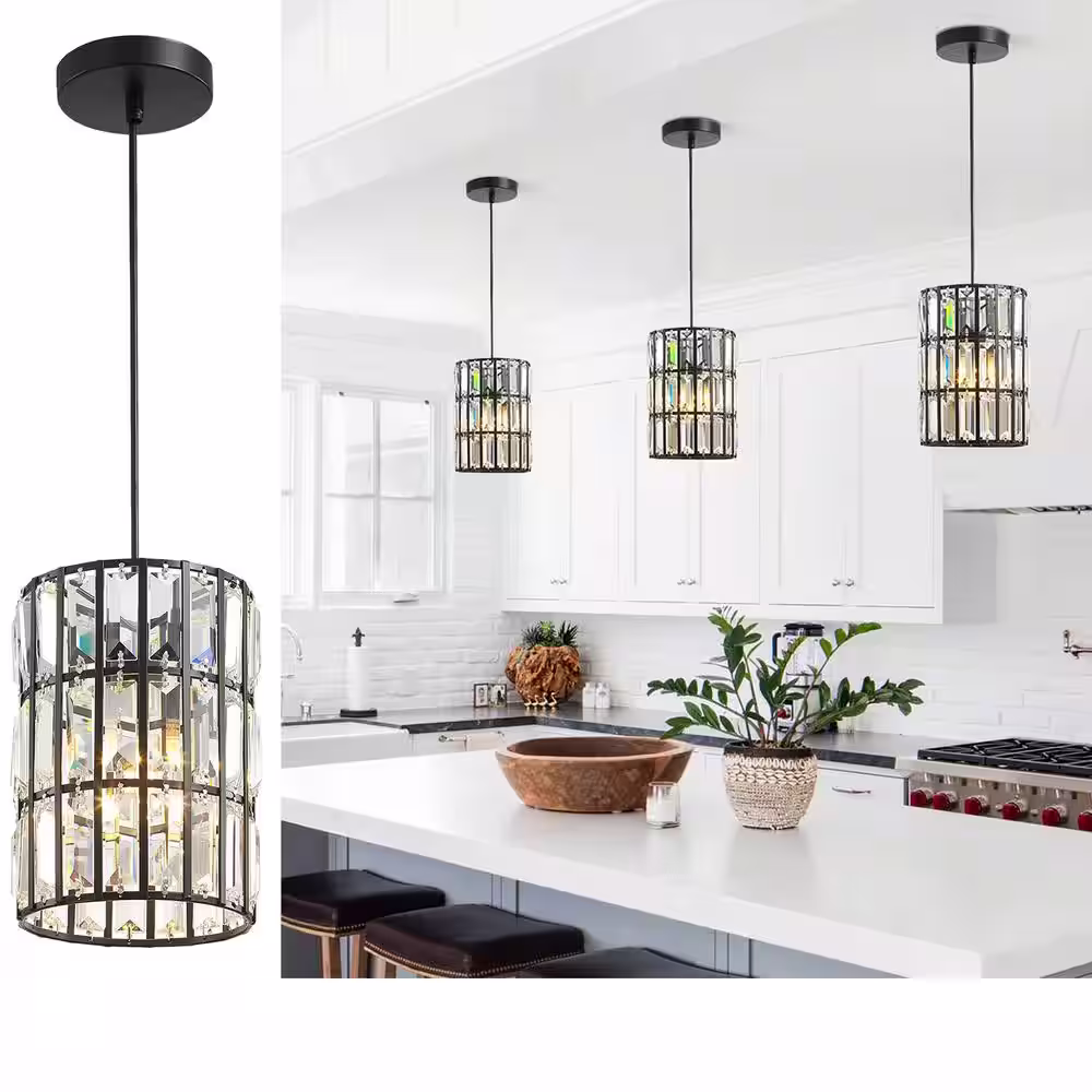 None 1-Light Modern Mini Pendant Light Black Crystal Hanging Chandelier for Kitchen Island