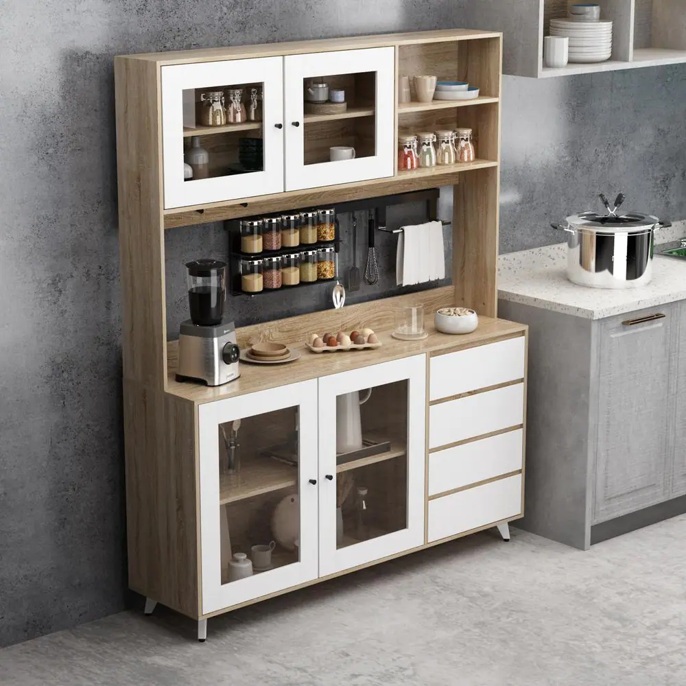 None 63 in. W Kitchen Light Brown Wood Buffet Sideboard Pantry Cabinet with Glass Doors, 4-Drawers, Hooks, Open Shelves