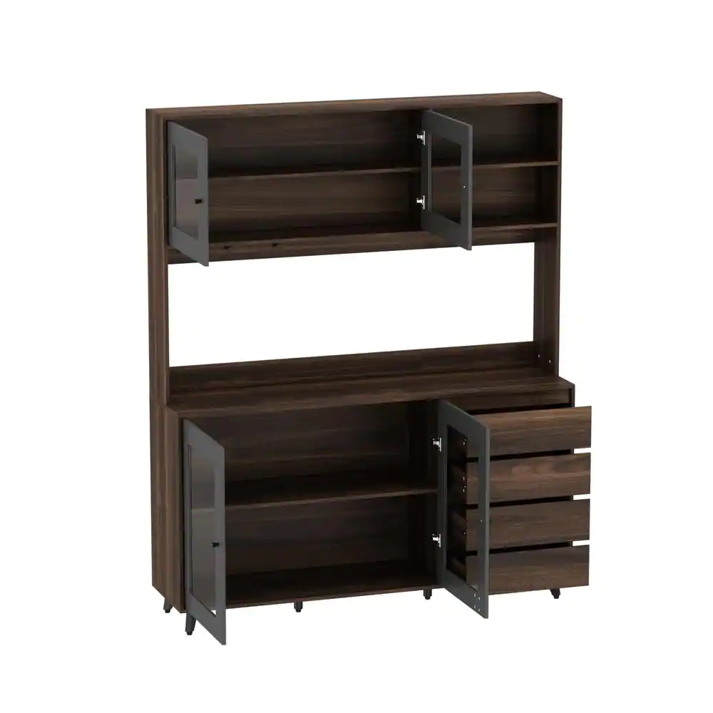 None 63 in. L Brown Wood Kitchen Dining Food Pantries Sideboard with 4-Drawers, Hooks, Open Shelves, Glass Doors