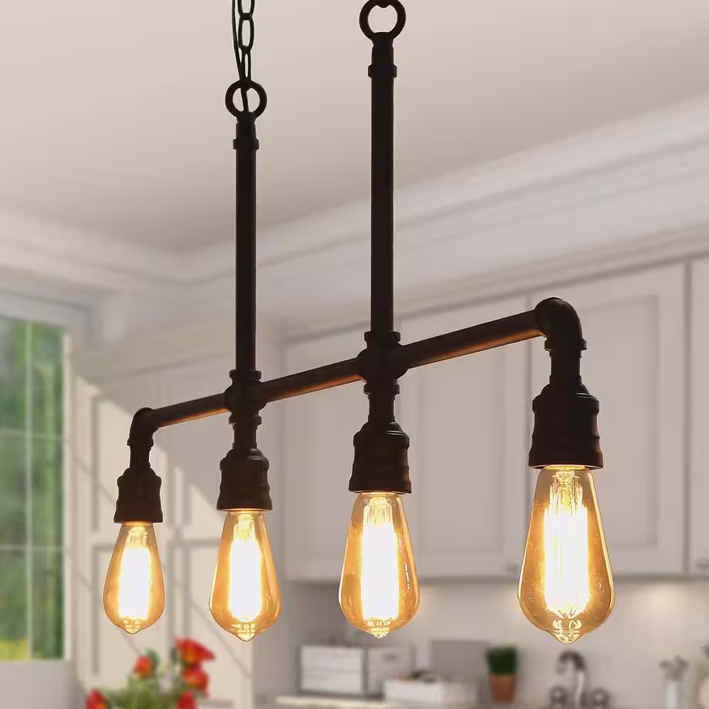 LNC Black Island Chandelier, Industrial 4-Light Linear Matte Black Pipe Chandelier Kitchen Hanging Pendant Light