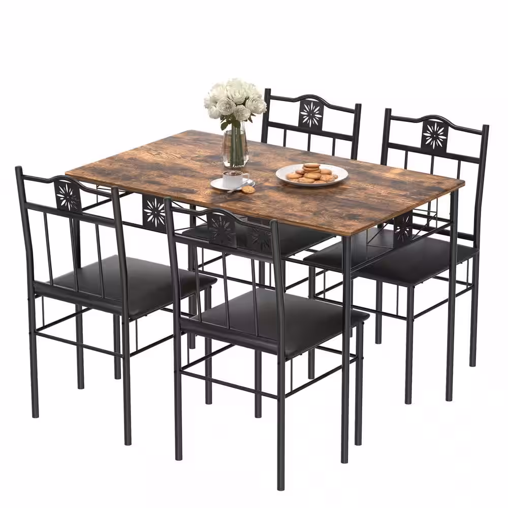 VECELO 5-Piece Dining Table Set Wooden Kitchen Table 1 Table 4 Chairs Metal Legs, Rectangular Dining Table Setsï¼?2.1"L, Brown