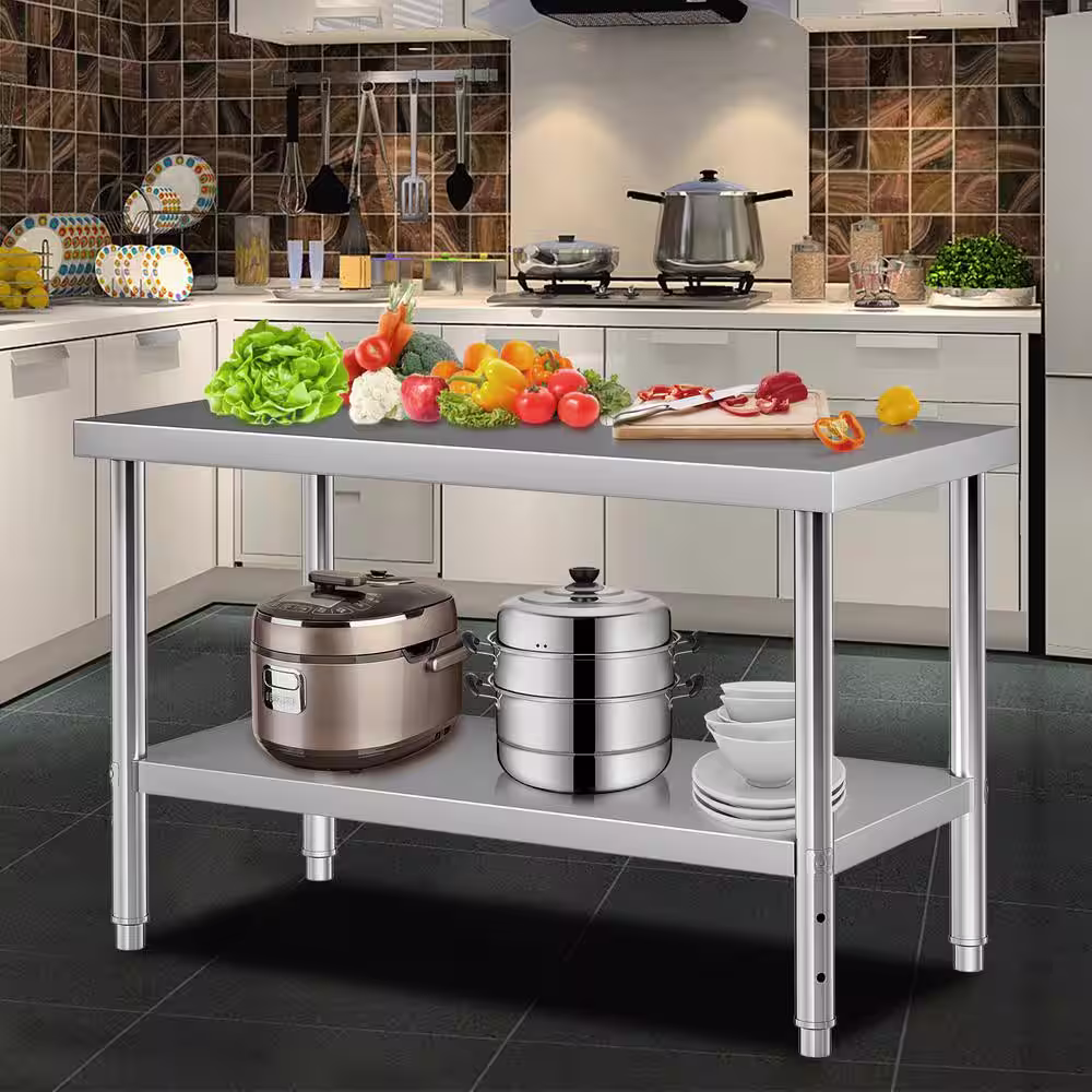 VEVOR Stainless Steel Prep Table 48x24x34 in. Heavy Duty Metal Worktable with Adjustable Undershelf Kitchen Prep Table,Silver