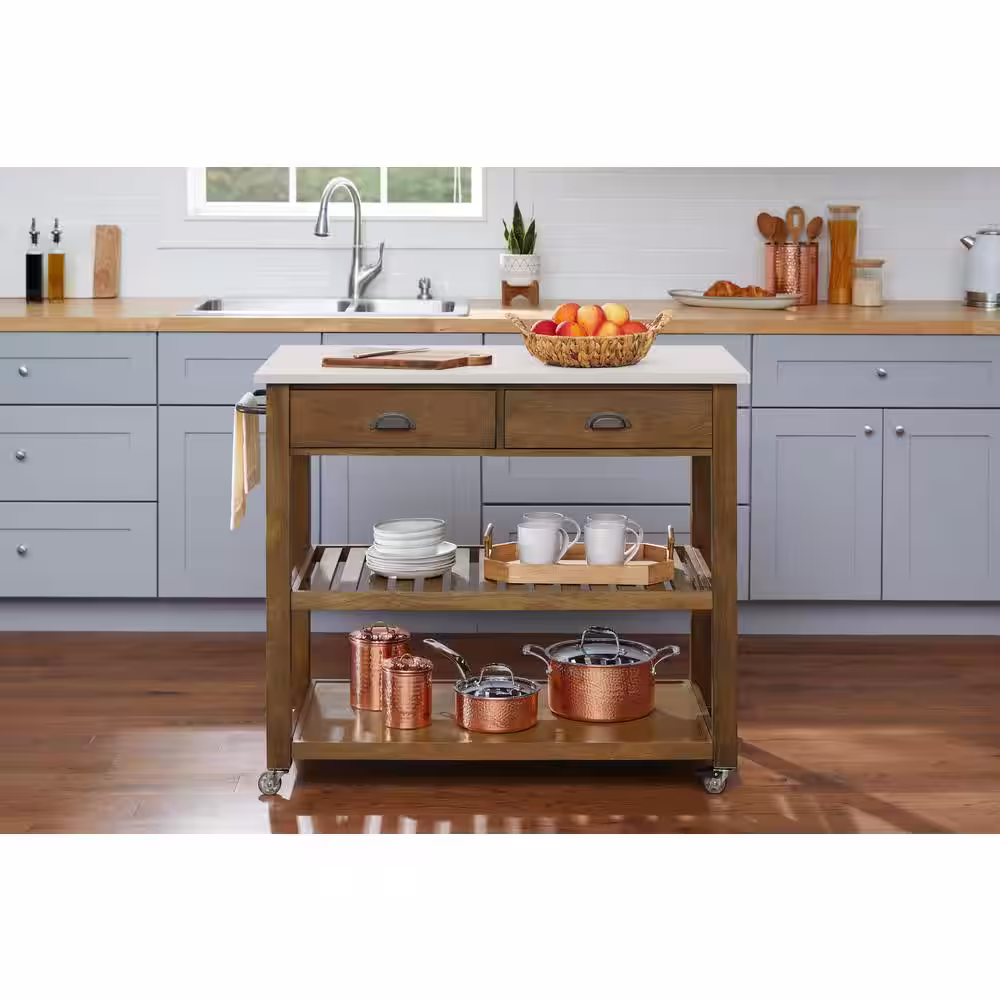 Home Decorators Collection Alstead Wooden Farmhouse Rolling Kitchen Cart with White Marble Top and Double-Drawer Storage (44in. W)