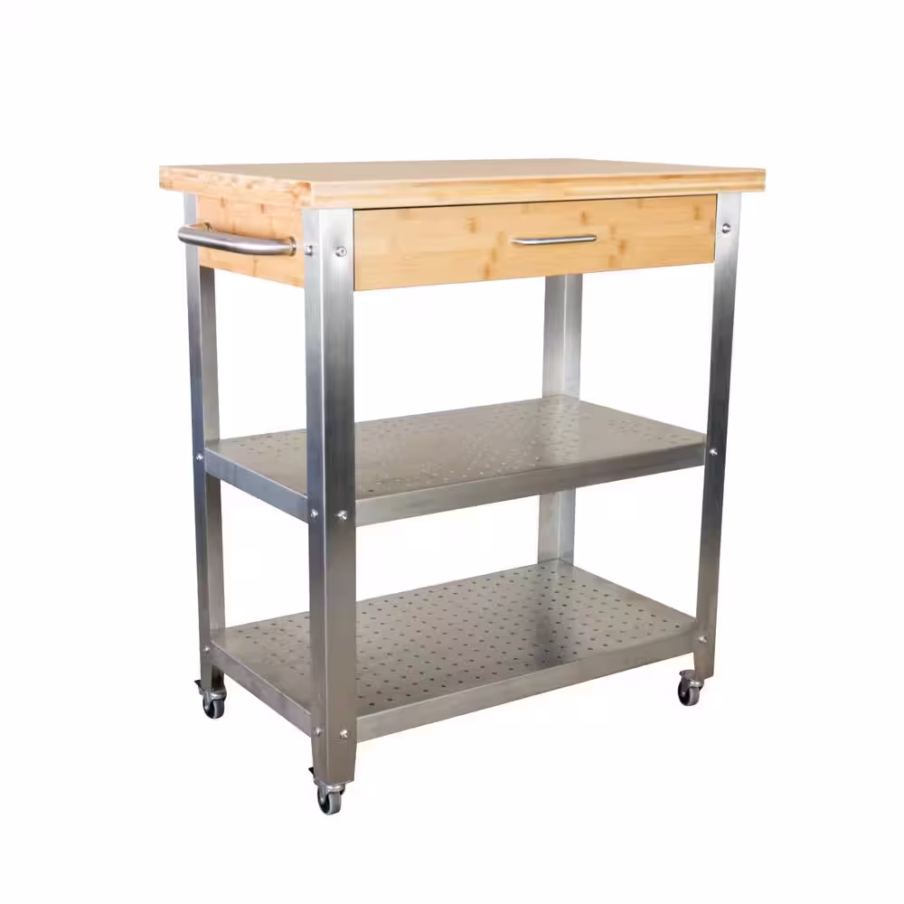 Eccostyle 1 Drawer, 2 Shelf Natural Bamboo & Stainless Steel Rolling Kitchen Cart with Side Dishtowel Bar