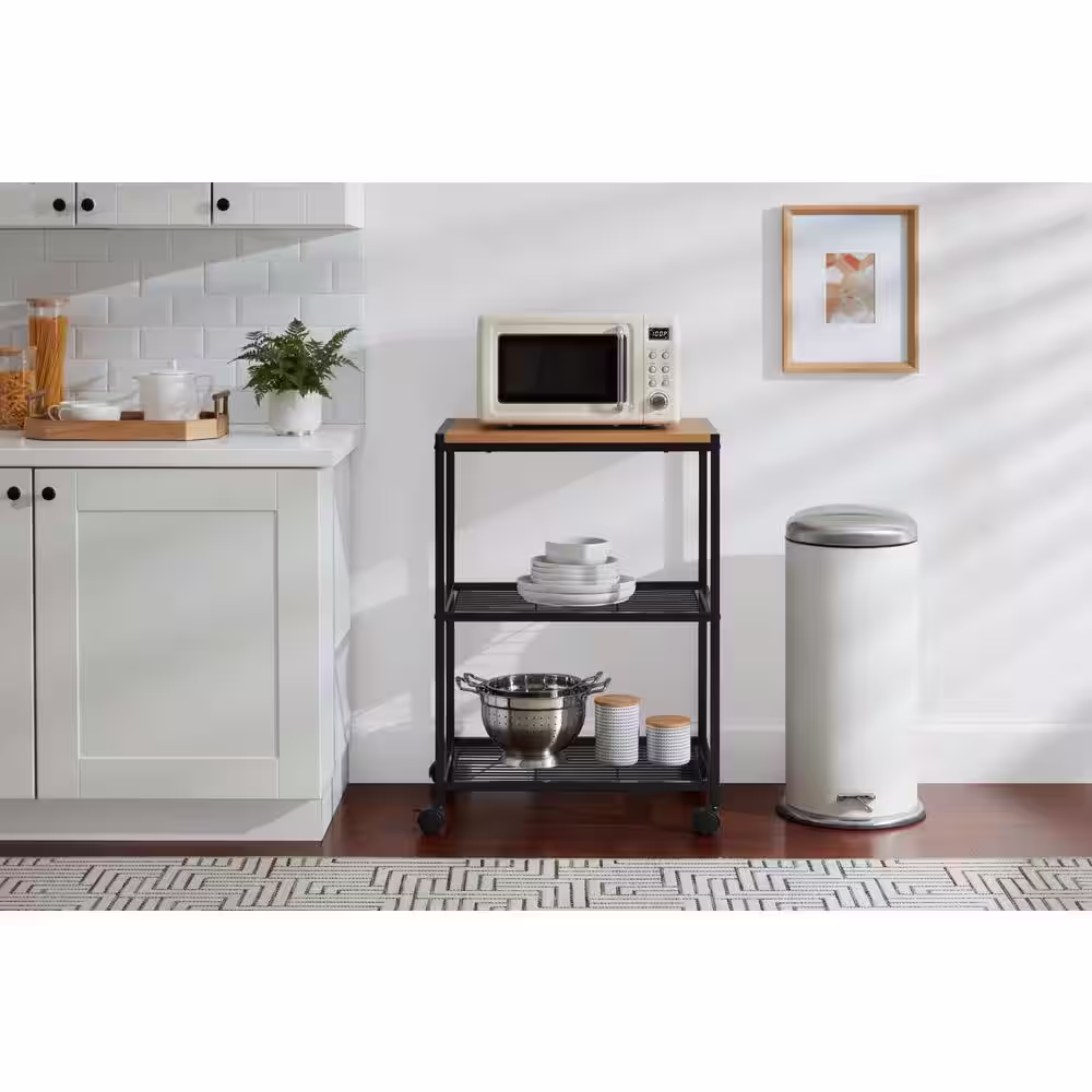 StyleWell Industrial Black Metal Rolling Kitchen Microwave Cart with Wooden Top and 2-Tier Shelving (24" W)