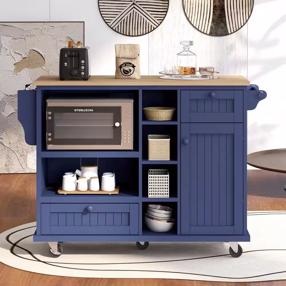 None Dark Blue Kitchen Island Cart with Wood Desktop, Microwave Cabinet, Floor Standing Buffet Server Sideboard