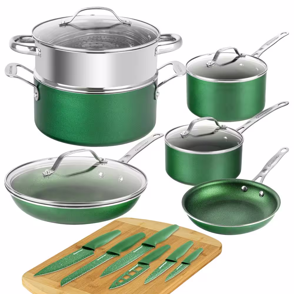 GRANITESTONE Emerald Green 17-Piece Aluminum Ultra-Durable Nonstick Diamond Infused Knives and Cookware Set with Cutting Board