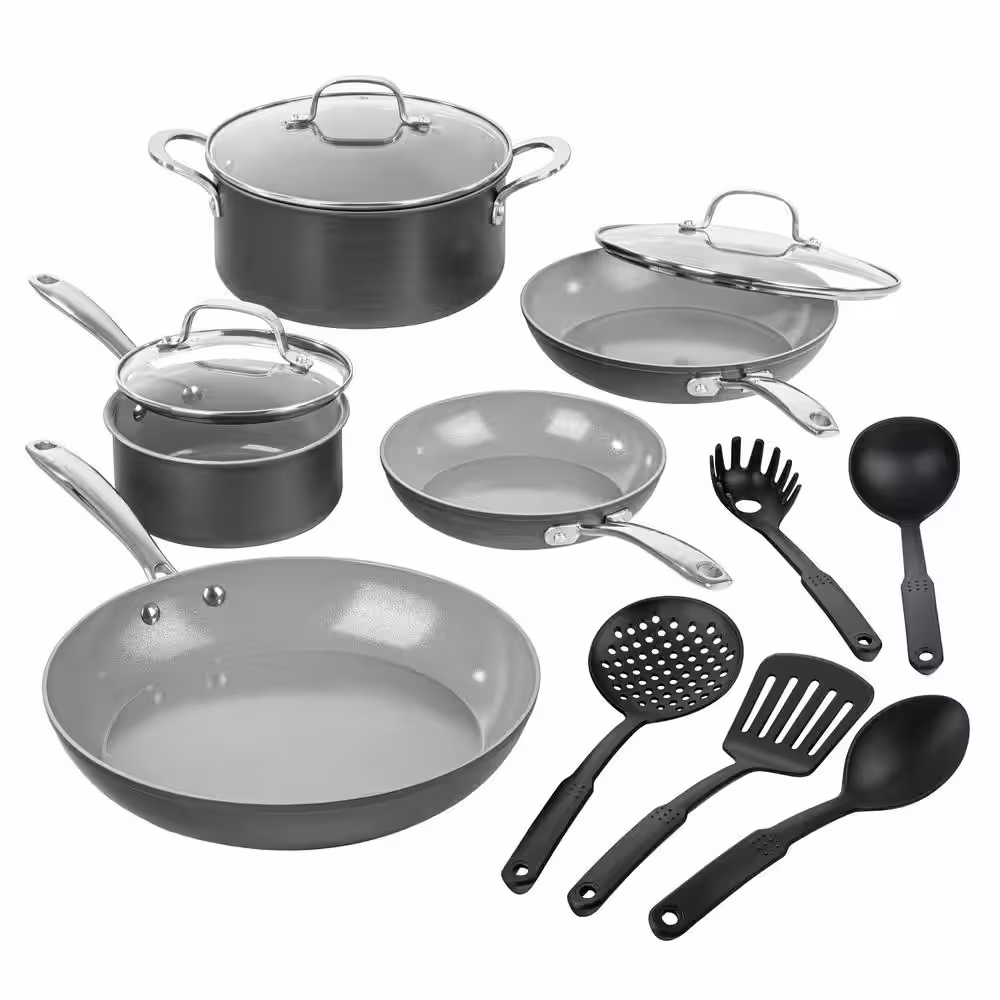 GRANITESTONE Professional 13-Piece Aluminum Hard Anodized Grey Ceramic Coating Nonstick Premium Cookware Set with Utensils