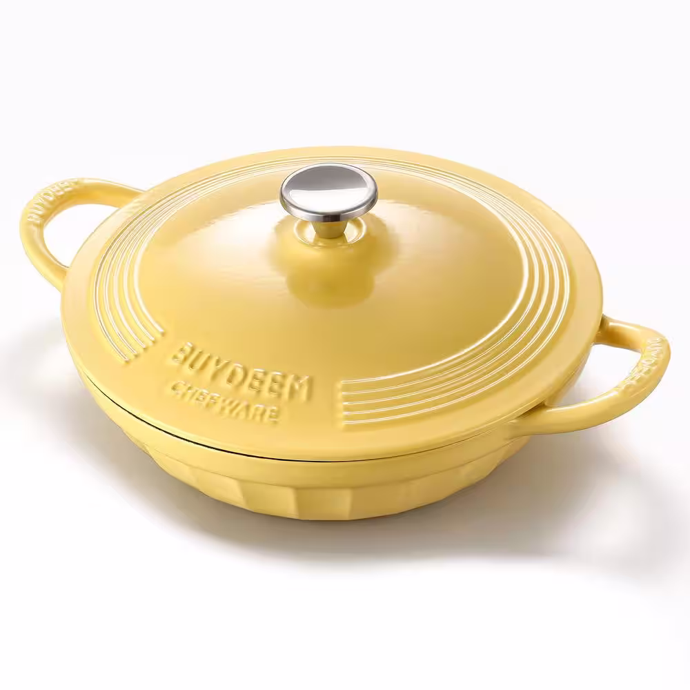BUYDEEM 3.5 qt. Round Enameled Cast Iron Braiser Pan in Yellow with Lid, Cupcake Design with Stainless Steel Knob and Handles