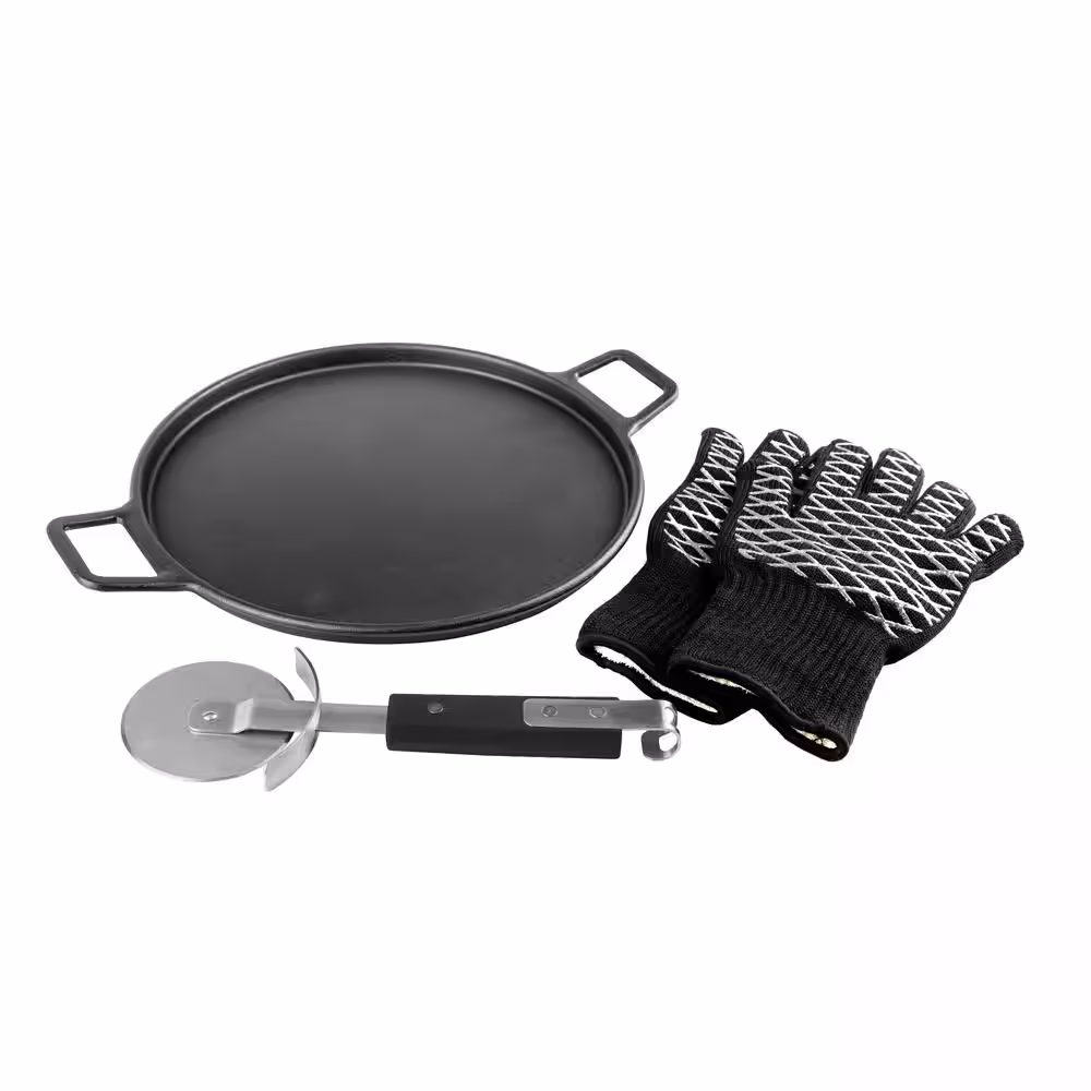 PITMASTER KING 4-Piece Cast Iron Pizza Stone/Round Griddle/Skillet with Handles, Pizza Cutter, Heat Resistant Gloves
