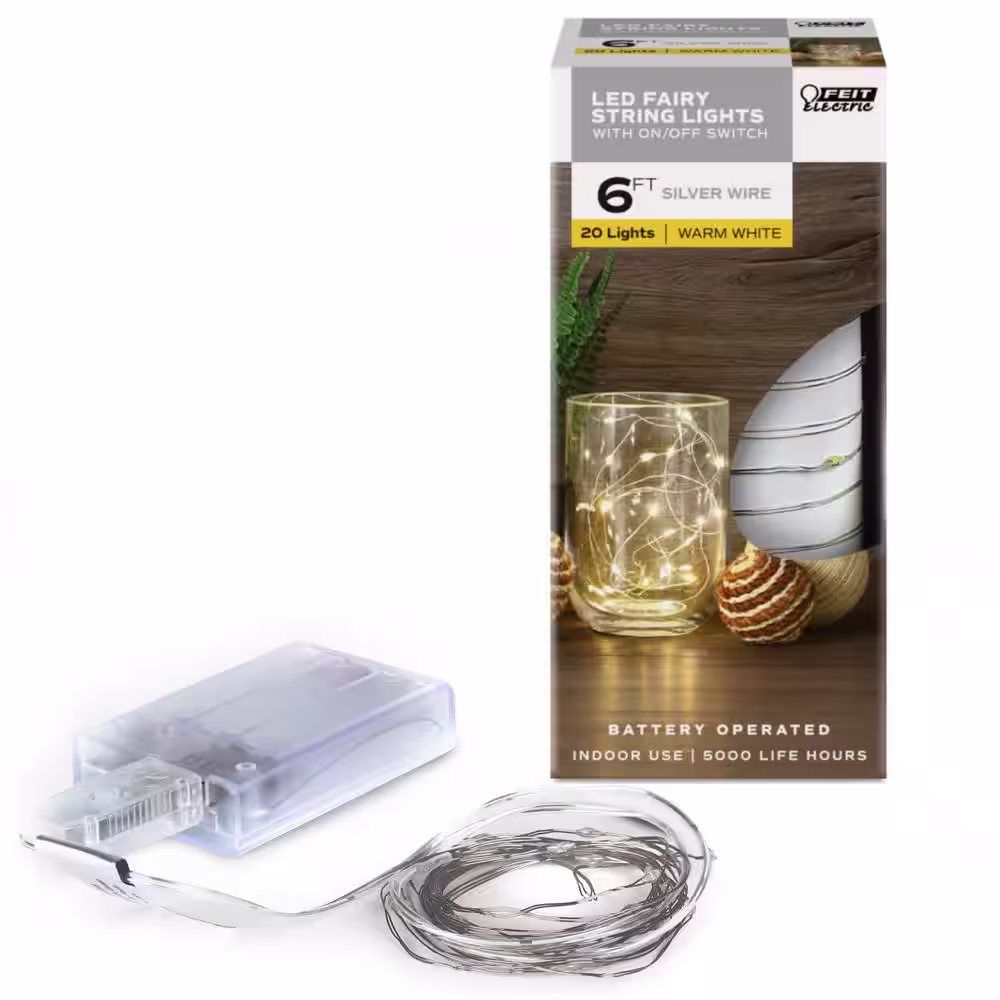 Feit Electric 20-Light 6 ft. Battery Operated Mini LED Indoor Silver Wire Warm White Fairy String Light (24-Pack)