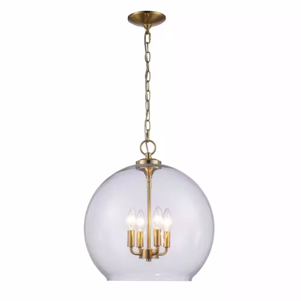 Home Decorators Collection Kingsley 4-Light Aged Brass Oversized Pendant Light Fixture with Clear Glass Shade