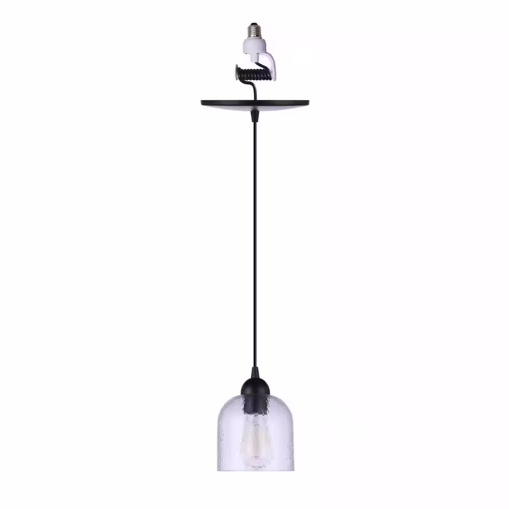 Worth Home Products Instant Pendant 1-Light Matte Black Recessed Light Conversion Kit with Clear Hammered Glass Shade