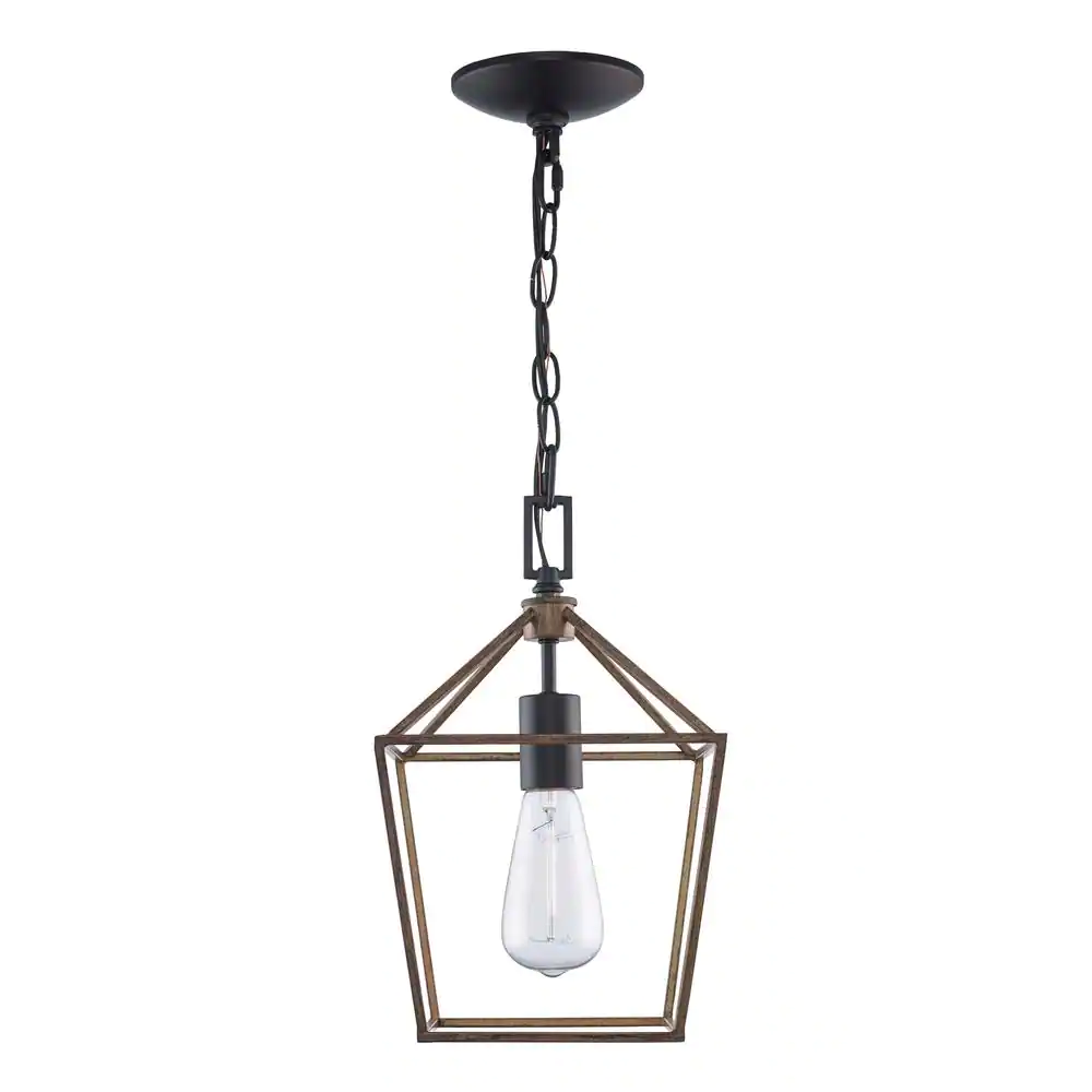 Home Decorators Collection Weyburn 1-Light Black and Faux Wood Farmhouse Mini Pendant Light Fixture with Caged Metal Shade
