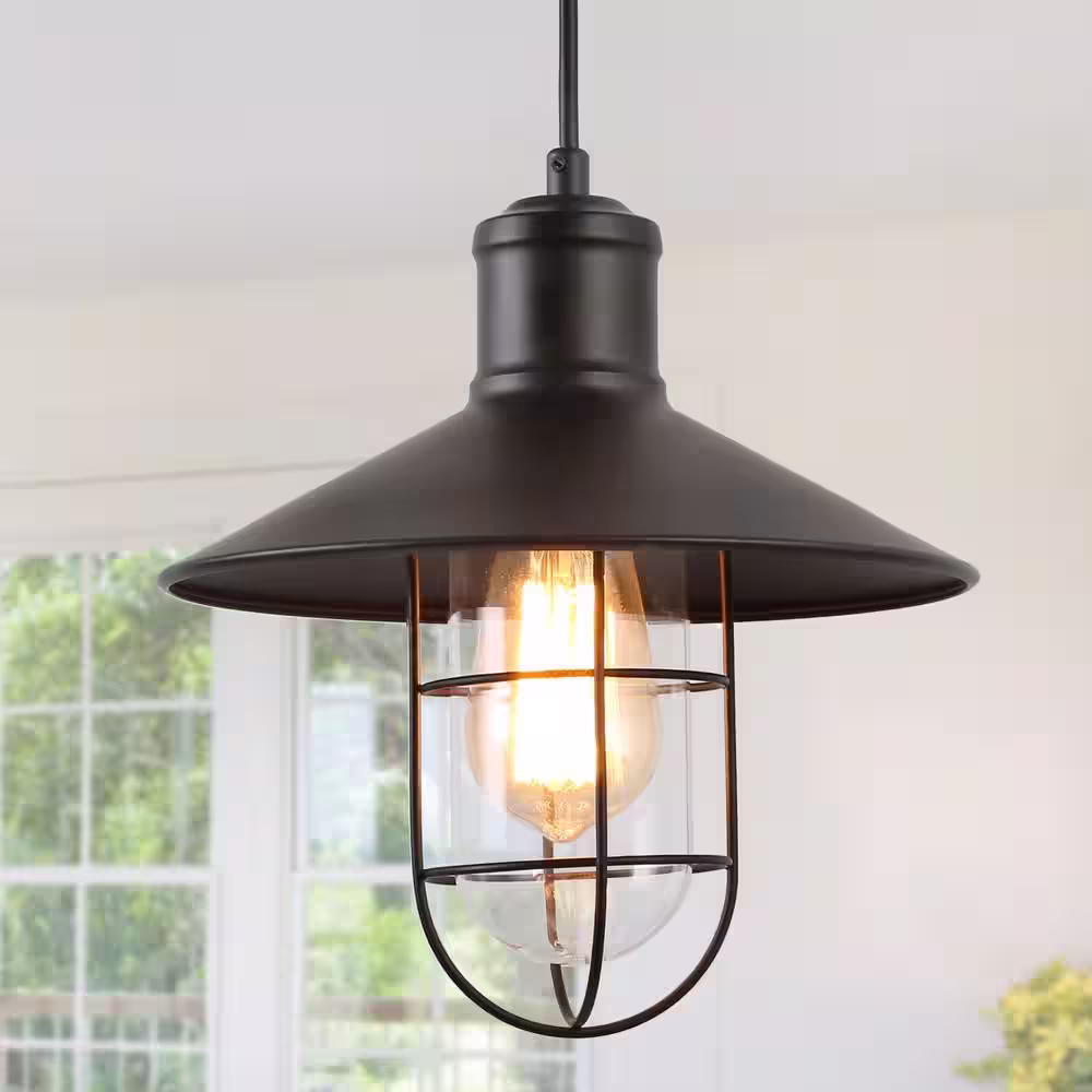 LNC Modern Industrial 1-Light Black Pendant with 10.2 in. W Clear Glass Shade Metal Wire Cage Shade Barn Ceiling Chandelier
