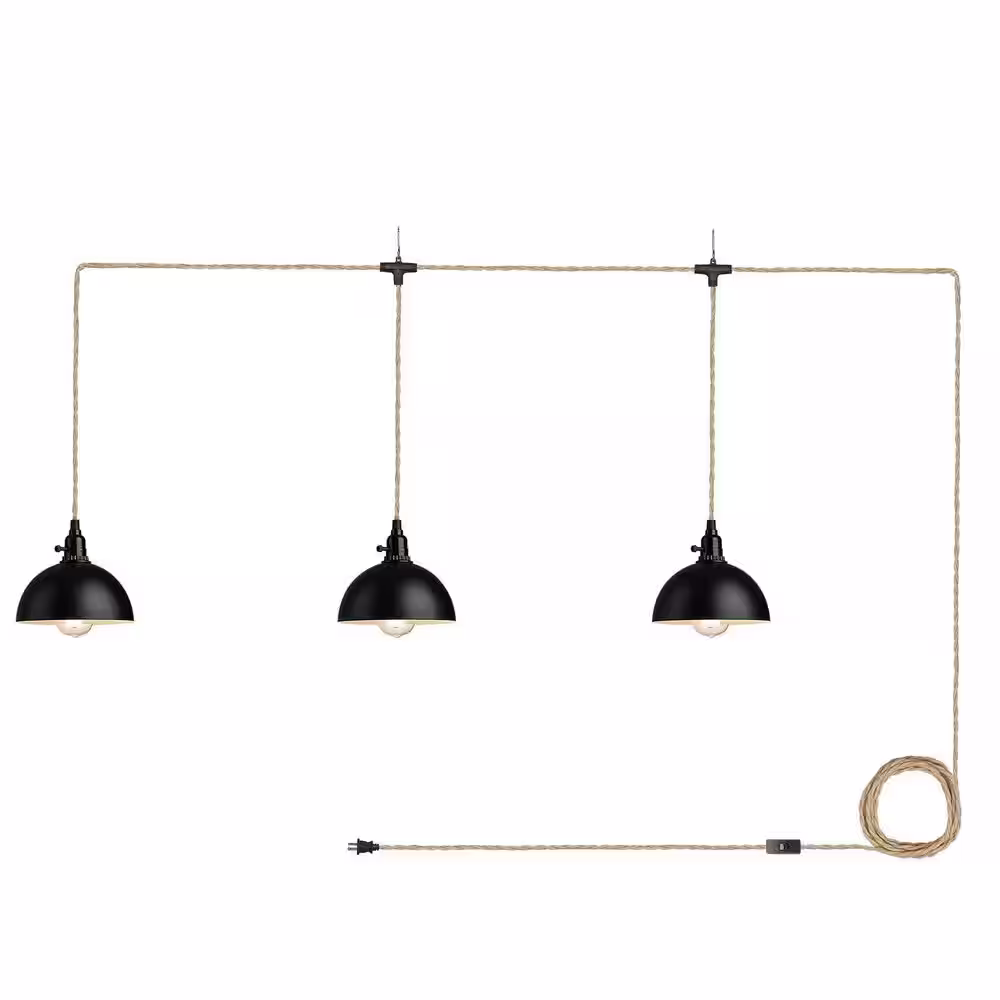 JAZAVA 3-Light Black Standard Shaded Hanging Lamps Pendant Light with Plug in Cord 29 ft. Twisted Hemp Rope Switch