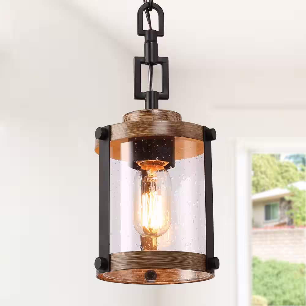 LNC Modern Farmhouse Brown Chandelier 1-Light 6 in. Black Drum Mini Island Pendant Light with Seeded Glass Shades