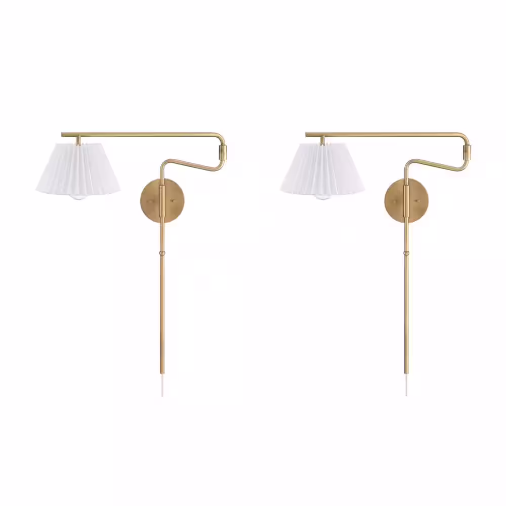 Nathan James Kai 30 in. W 2-Light Set Vintaged Brass Modern Wall Mounted Plugin Bedside Lamp Wall Sconce w/Pleated Shade (Set of 2)