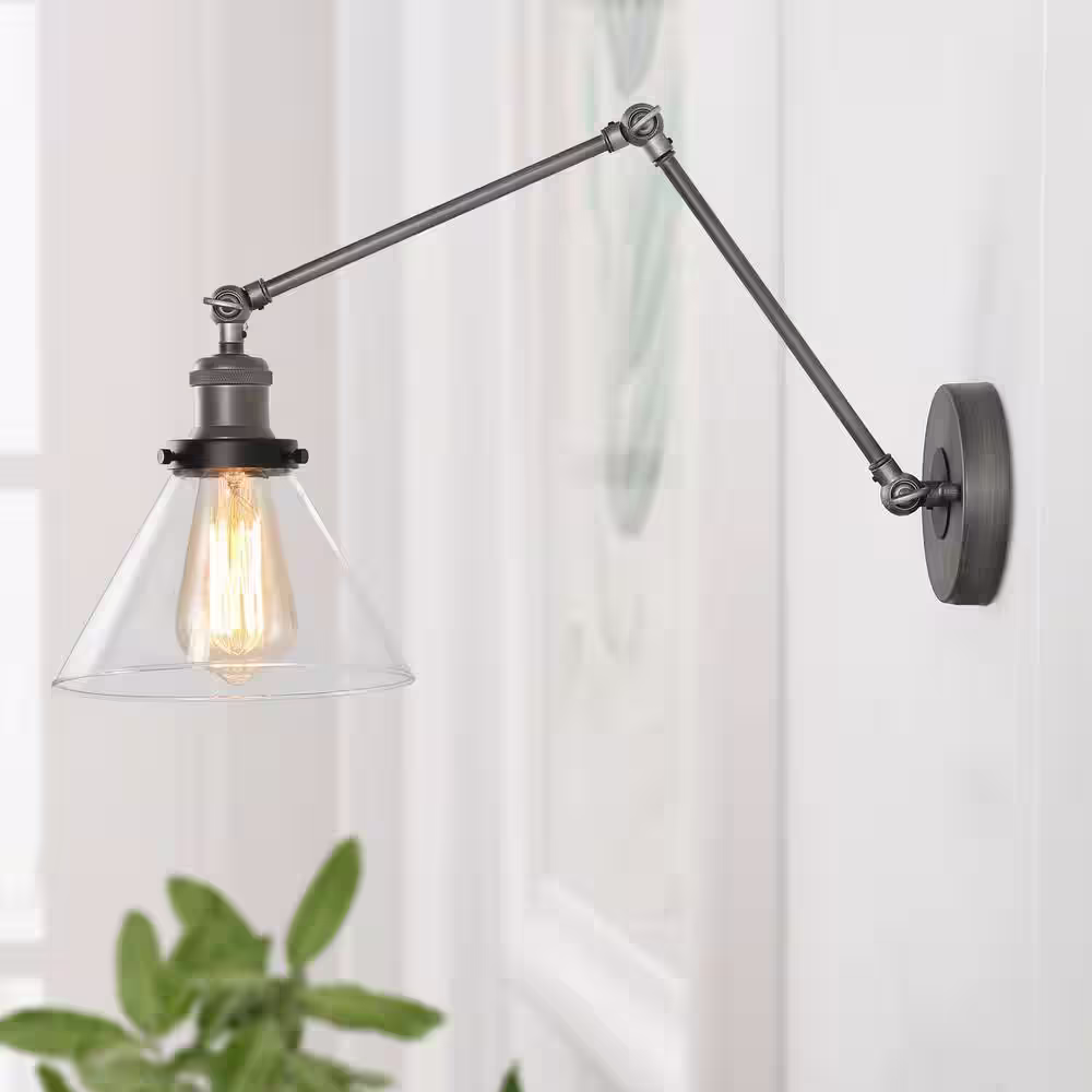 LNC Adjustable 1-Light Black Plug-In or Hardwire Modern Industrial Swing Arm Wall Sconce with Clear Glass Shade