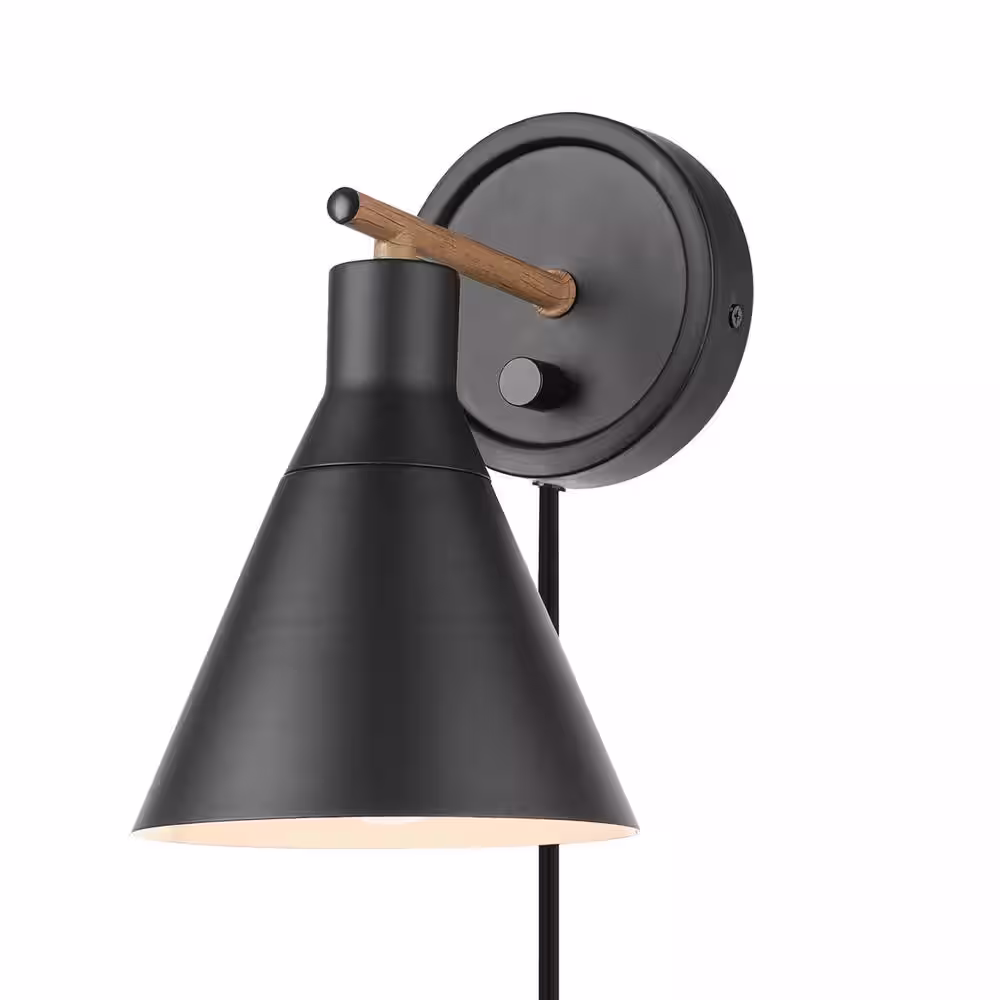Globe Electric Tristan 4.8 in. Matte Black Plug-In or Hardwire Sconce with Faux Walnut Accent, Black Fabric Cord