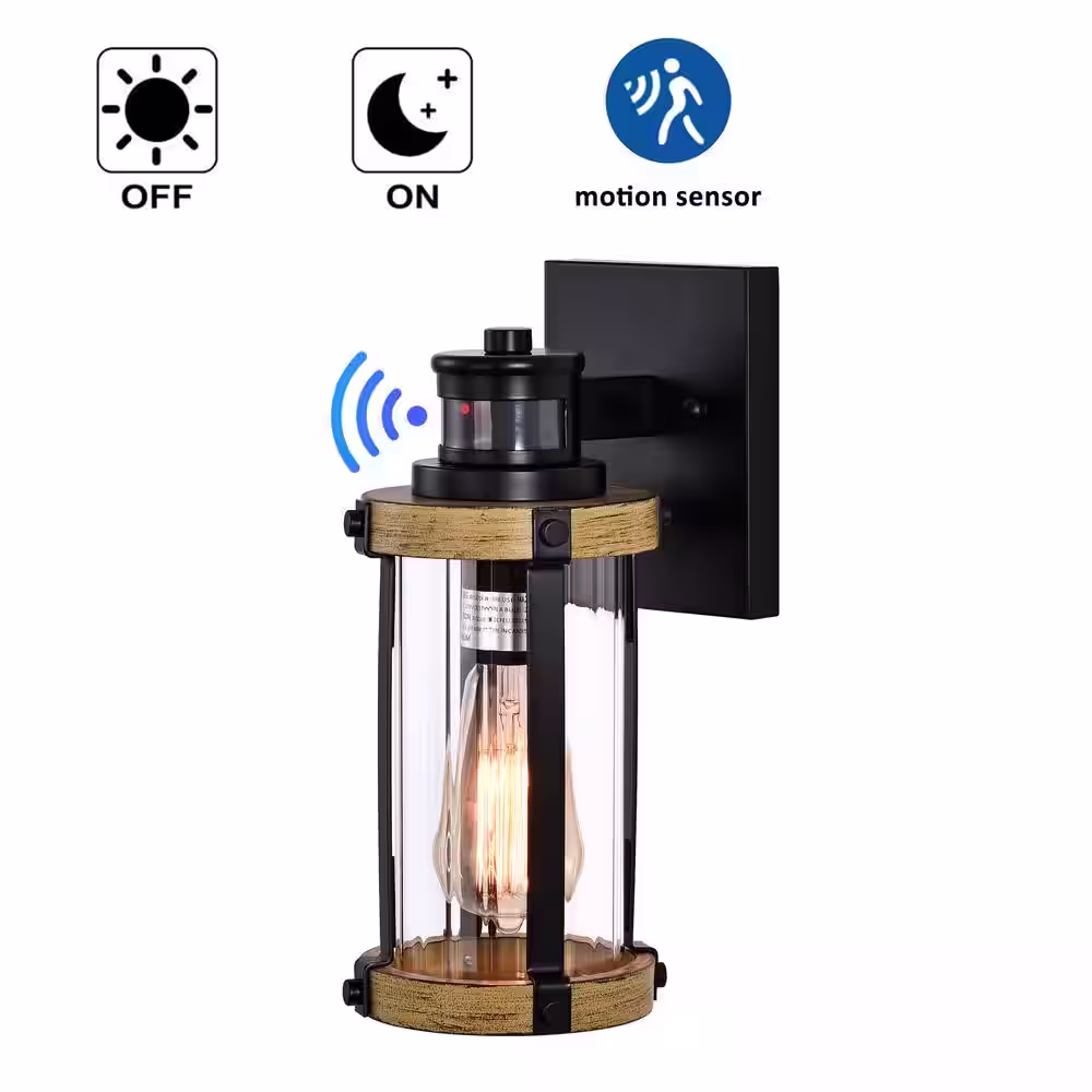 C Cattleya 1-Light Black and Woodgrain Motion Sensing Dusk to Dawn Outdoor Wall Sconce with Striped Clear Glass
