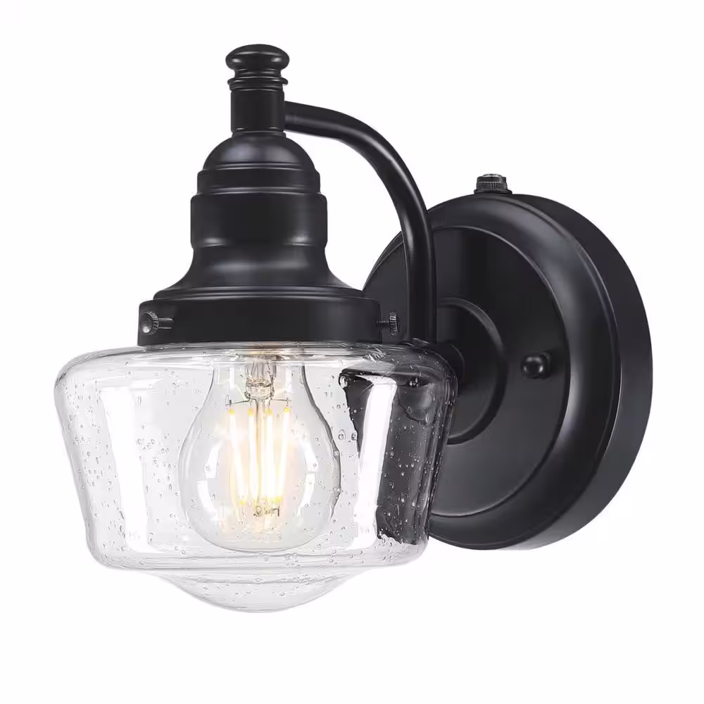Westinghouse Eddystone 1-Light Matte Black Outdoor Wall Mount Sconce with Clear Seeded Glass, Dusk to Dawn Sensor