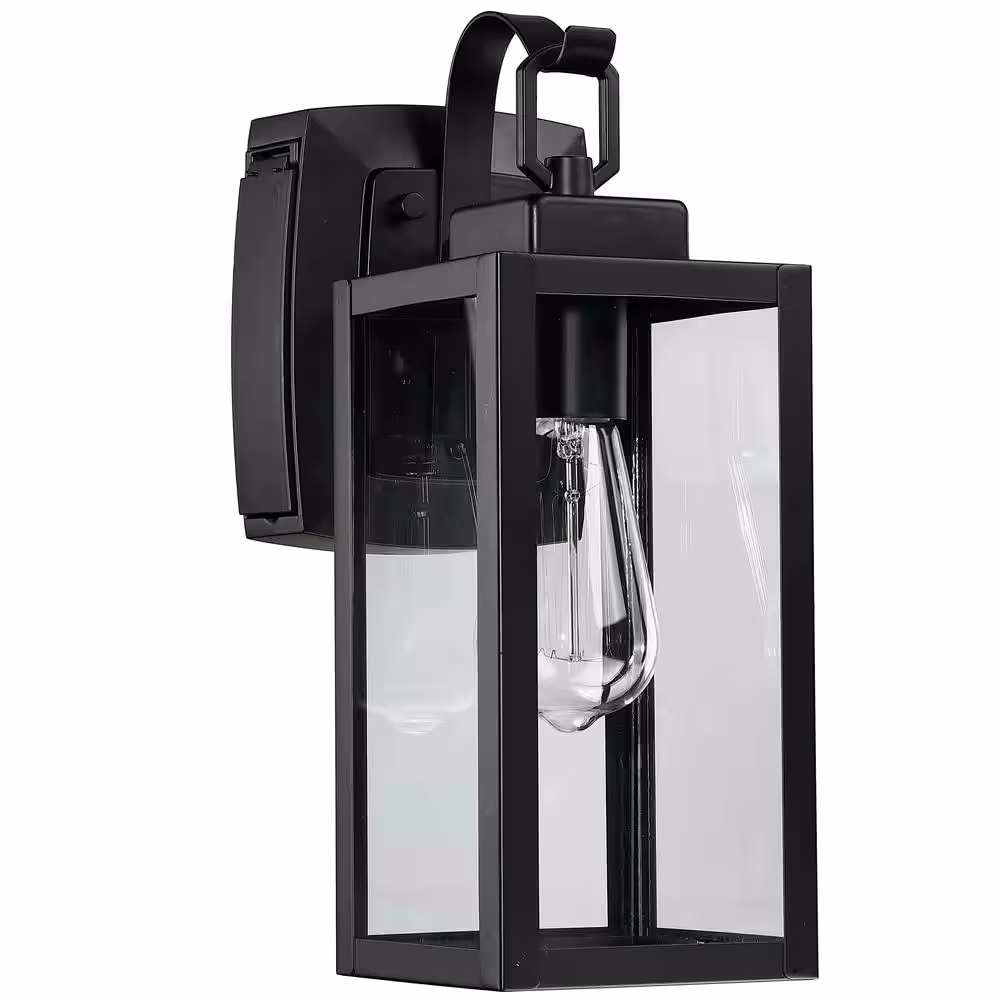 None 1-Light Matte Black Light Outdoor Wall Lantern Sconce with Clear Glass and Built-In GFCI Outlets