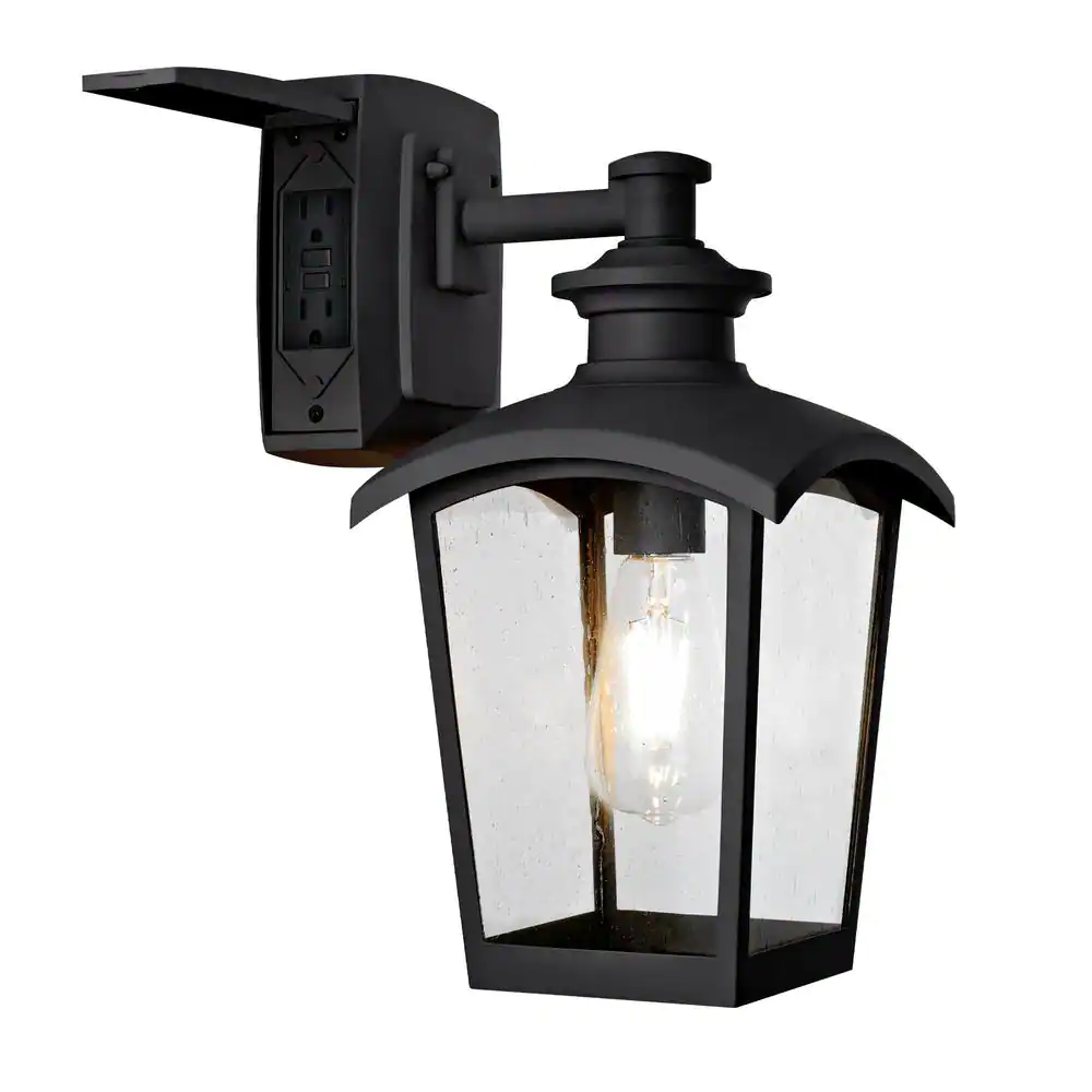 Home Luminaire 1-Light Black Outdoor Wall Coach Light Sconce with Seeded Glass and Built-In GFCI Outlets