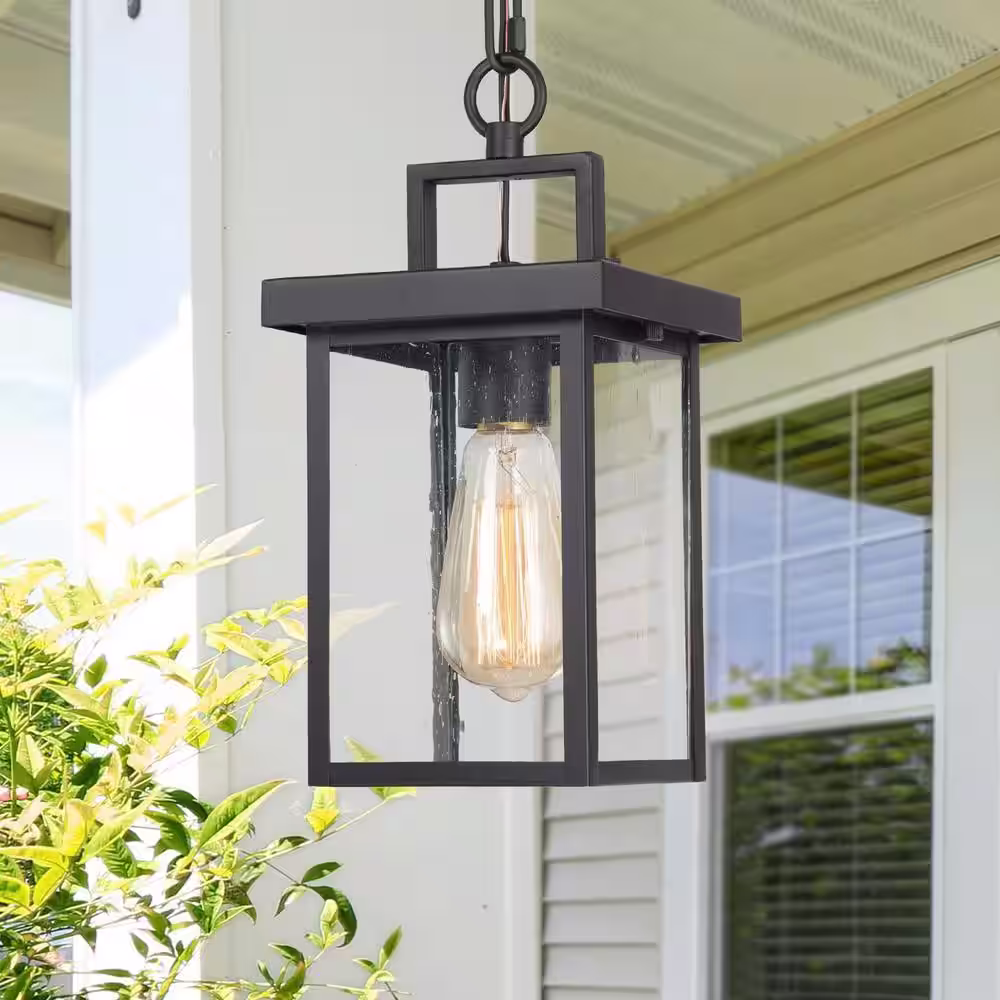 LNC 1-Light Black Square Outdoor Pendant Light for Patio Modern Outdoor Hanging Light with Seeded Glass Shade