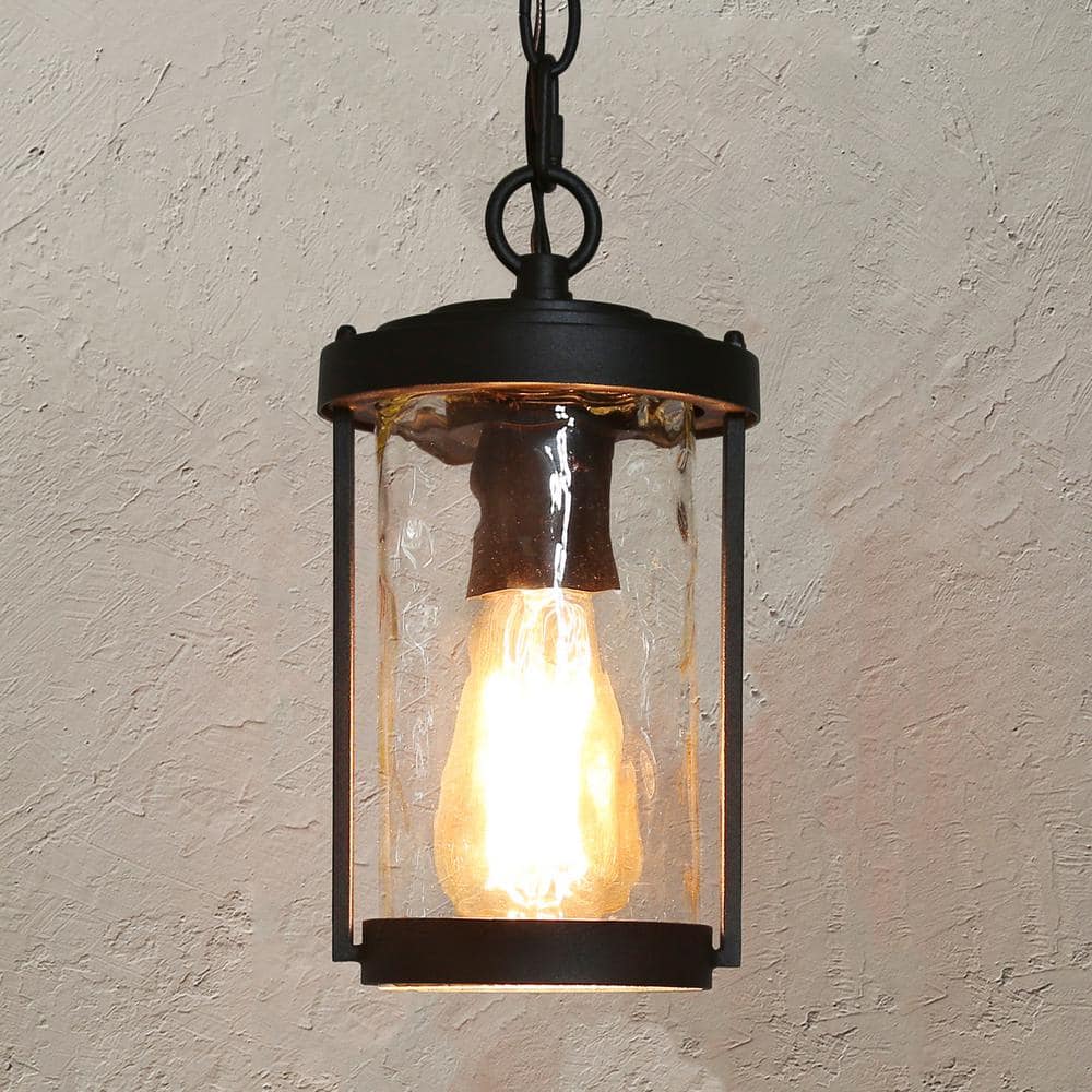 Uolfin Modern Cylinder Outdoor Porch Pendant Light 1-Light Matte Black Farmhouse Patio Hanging Light with Water Glass Shade