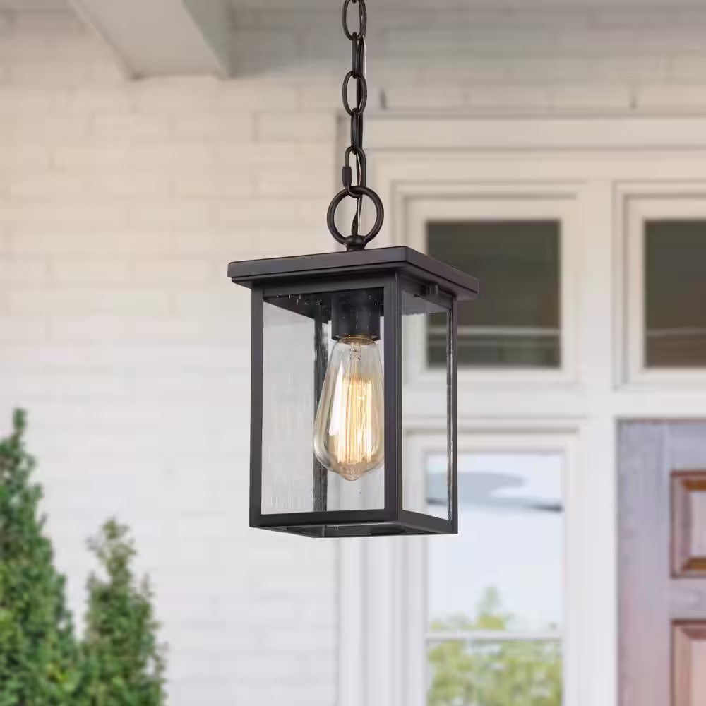 LNC Matte Black Rustic Outdoor Hanging Lantern, Mini Farmhouse 1-Light Square Outdoor Pendant Light with Seeded Glass Shade