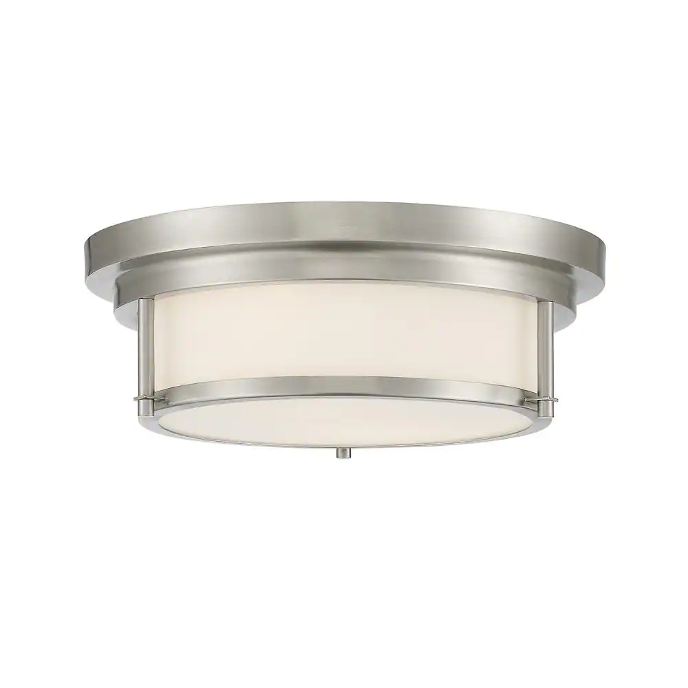 Savoy House 13 in. W x 4.5 in. H 2-Light Brushed Nickel Outdoor Flush Mount Light with White Glass Cylindrical Shade