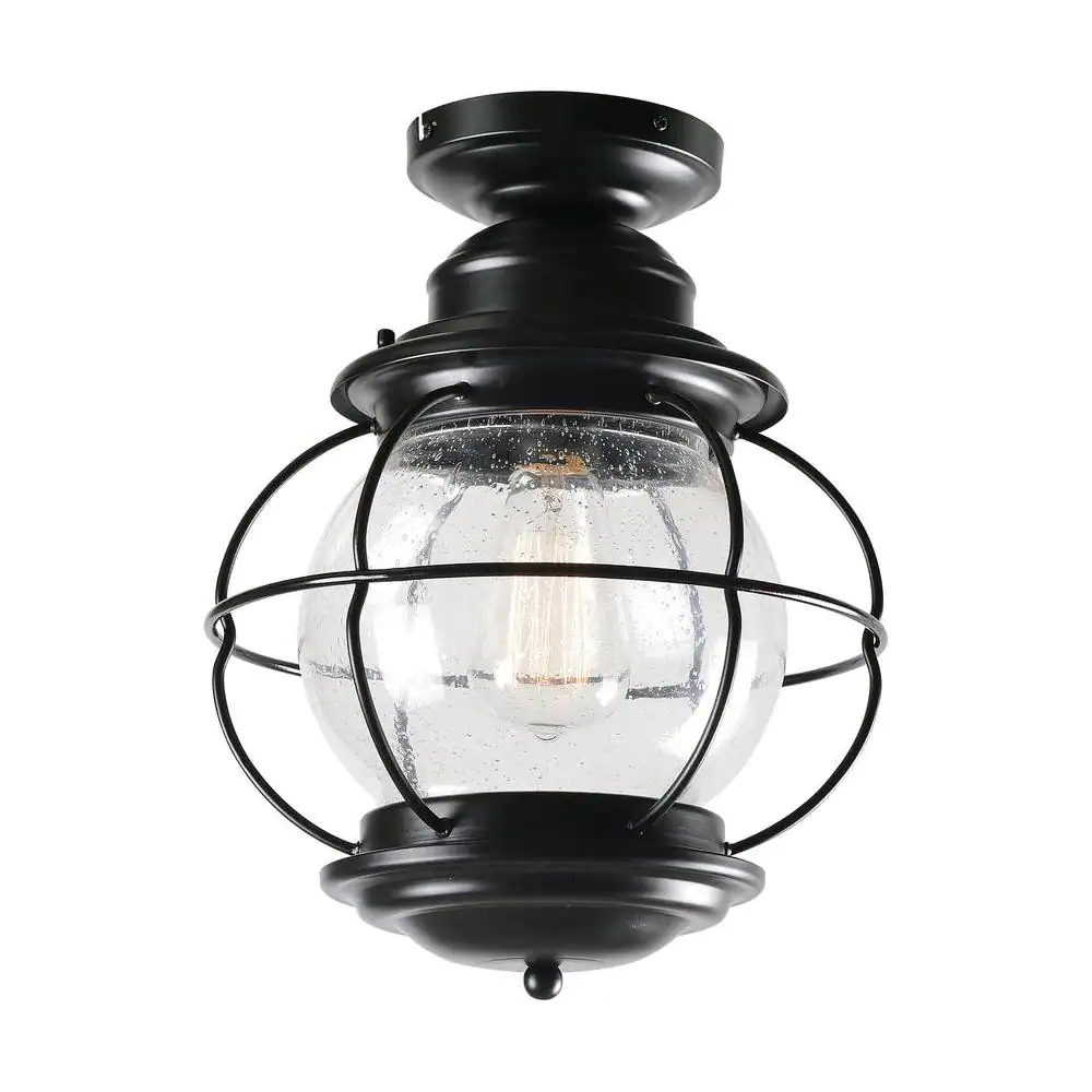Home Decorators Collection Greer 1-Light Black Outdoor Semi-Flush Mount Ceiling Light with Caged Seeded Glass