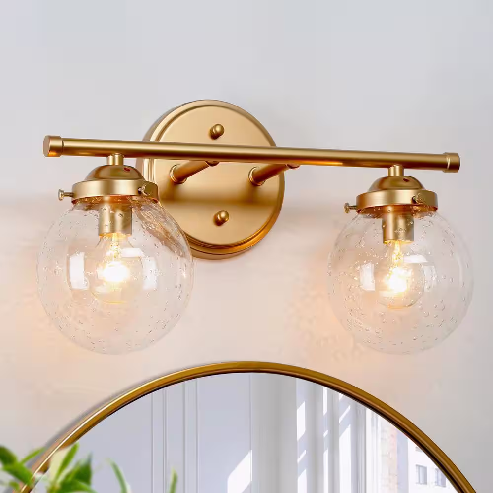 Uolfin Modern Globe Bathroom Vanity Light 2-Light Gold Round Bedroom Wall Sconce Light with Seeded Glass Shades