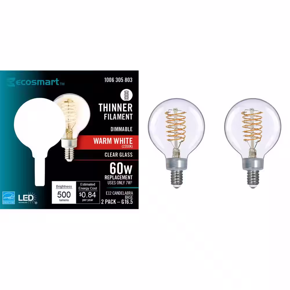 EcoSmart 60-Watt Equivalent G16.5 Dimmable Fine Bendy Filament LED Vintage Edison Light Bulb Warm White (2-Pack)