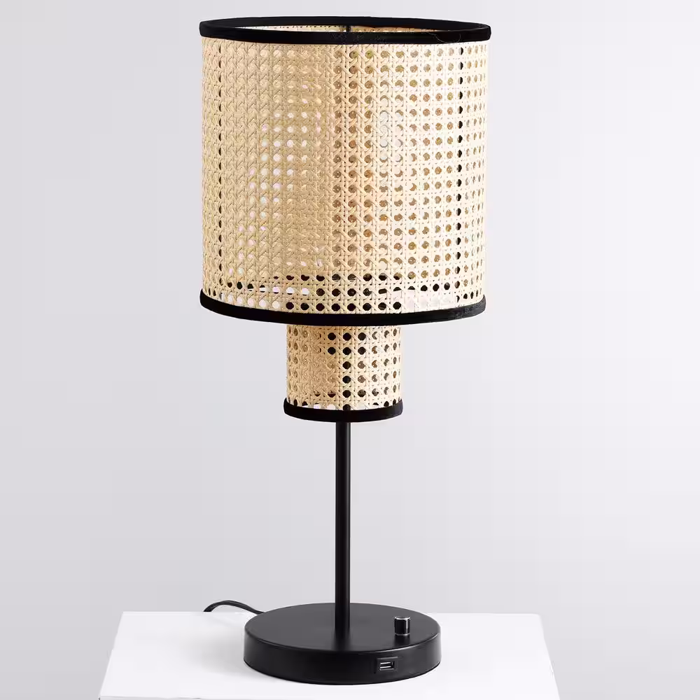 Vidalite Modern Bohemian 22 in. Beige Tan Table Lamp, 2 Tier PVC Rattan Shade With Velvet Rim, With USB Port