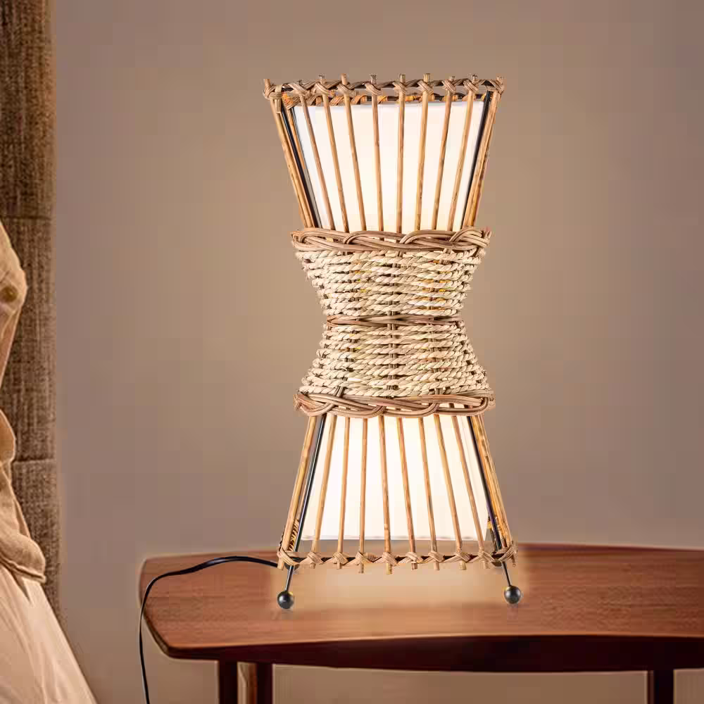 C Cattleya 13.5in. 2-Light Natural Plug-in Bamboo and Rattan Table Lamp for Bedroom Living Room with White Fabric Shade