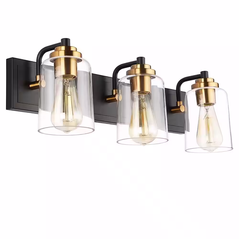 YANSUN 3-Light Matte Black Metal Vanity Light Farmhouse Industrial Wall Sconce with Clear Glass Shade Gold Socket Cups