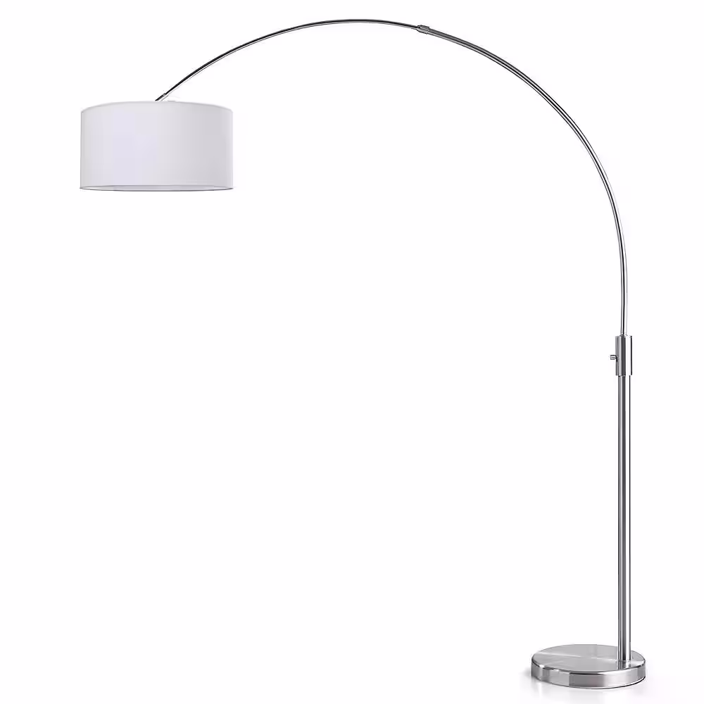 HomeGlam Orbita 82 in. Brushed Nickel Finish Dimmable Retractable Arch Floor Lamp, Bulb Included with Drum White Shade