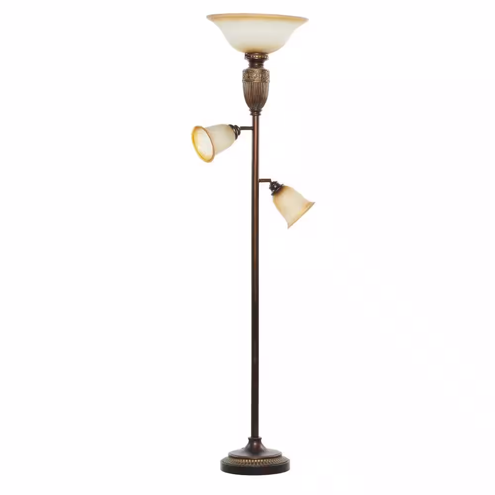 Litton Lane 70 in. Brown Antique Style 3 Light Task and Reading Torchiere with 2 Movable Glass Shades