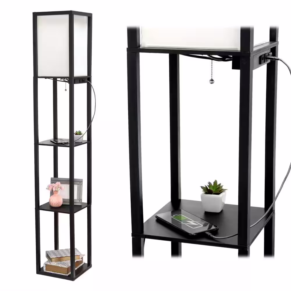 Simple Designs 62.5 in. Black Floor Lamp Etagere Organizer Storage Shelf with 2 USB Charging Ports, 1 Charging Outlet and Linen Shade