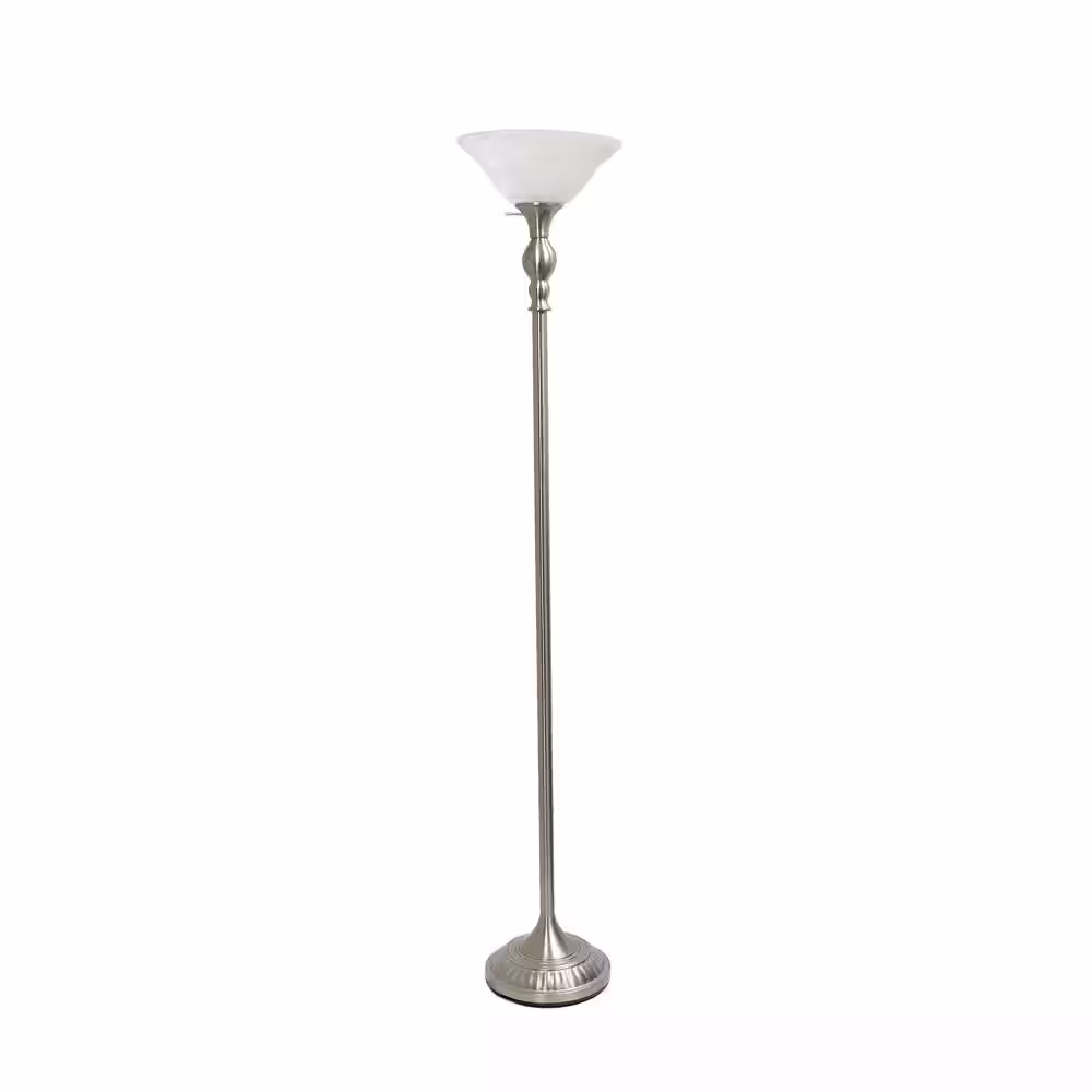 None 71 in. Brushed Nickel Classic 1-Light Torchiere Floor Lamp with White Marbleized Glass Shade