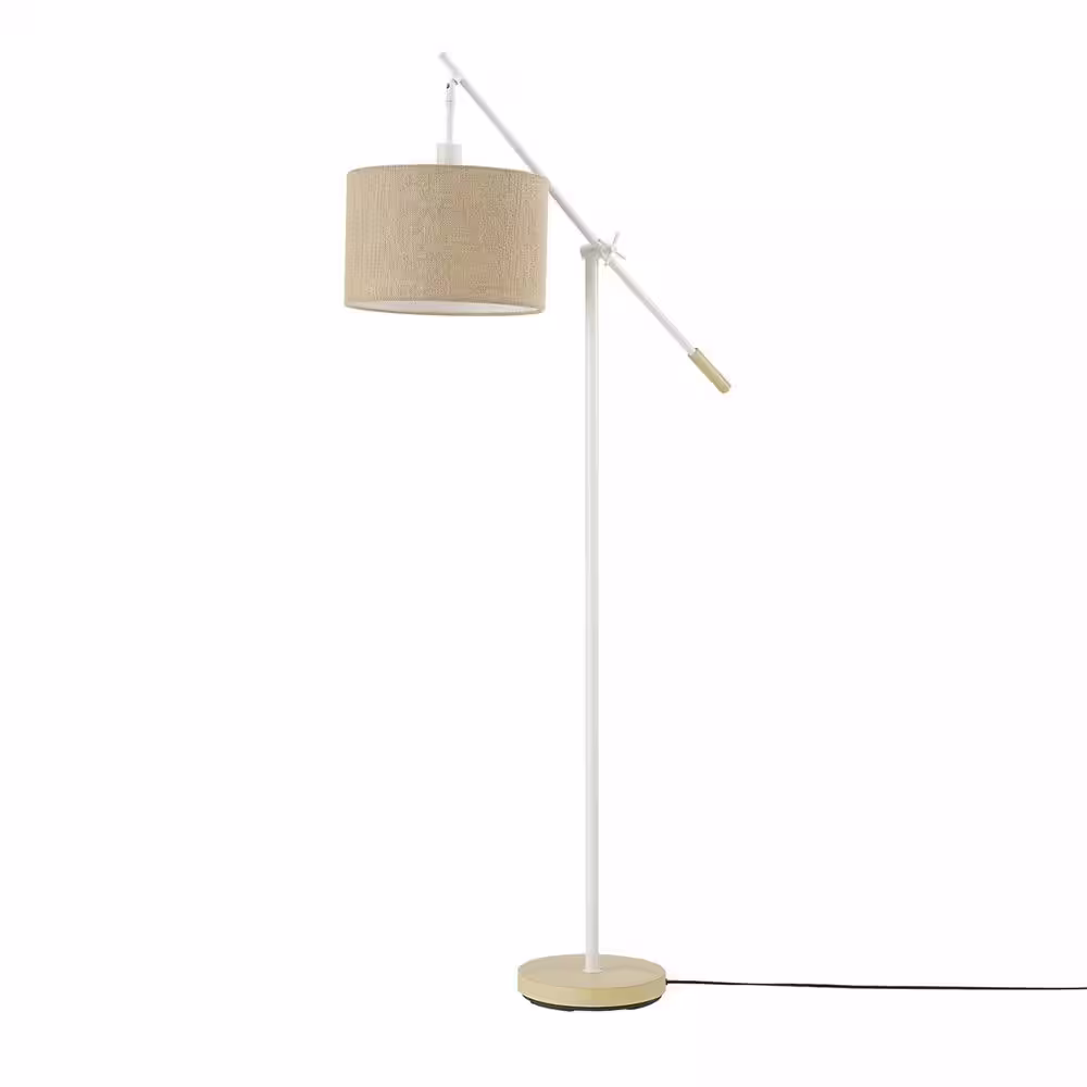 Globe Electric 66 in. Matte White Floor Lamp with Faux Wood Accents and Jute Shade, Dimmable Rotary Switch on Socket