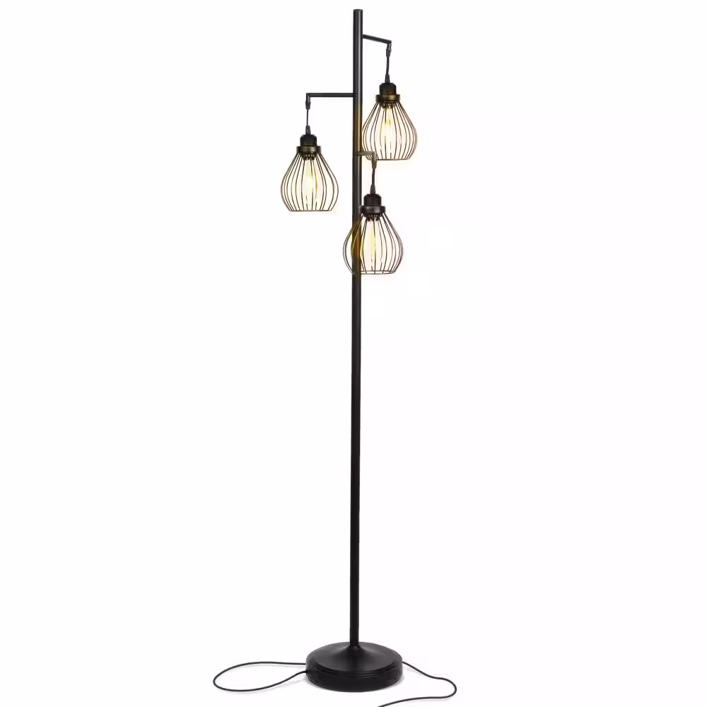 Brightech Teardrop 68 in. Black LED Tree Floor Lamp with 3 Cage Shades and Edison Bulbs