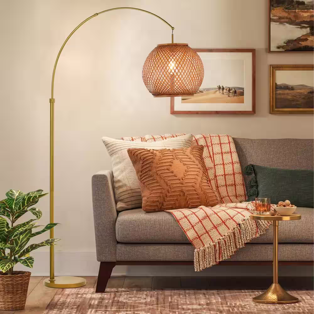 ALOA DECOR 77 in. 1-Light Antique Gold Arc Floor Lamp with Hand-woven Bamboo Shade