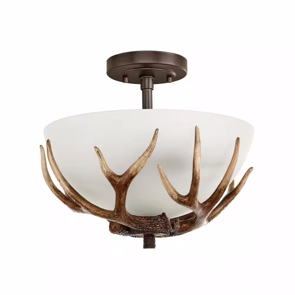 Hampton Bay Deer Lake 13 in. 2-Light Handmade Finish Anlter Convertible Semi-Flush Mount